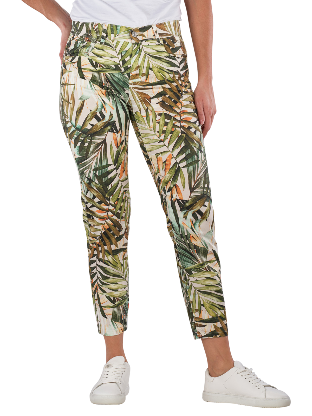 The Angels Ornella Pants Slim Fit in ecru with palm leaves design are the perfect addition to your wardrobe. These fashionable trousers offer a close fit and mid-rise waist, ideal for a slim look. Made from a high-quality cotton-elastane blend, they guarantee a high level of comfort and flexibility. With practical five-pocket details and a smart zip fastening, they are both casual and elegant and perfectly complement your individual style. Easy to care for and washable at 40°C.