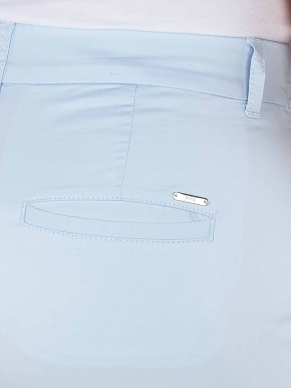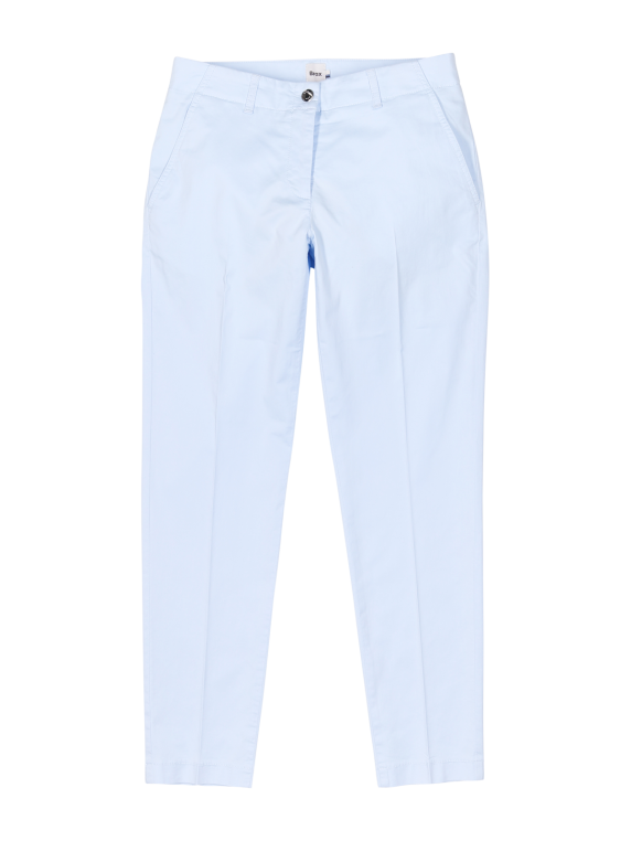 Discover the Brax Maron cropped chino in stylish light blue - the perfect addition to any summer wardrobe. These women's trousers offer a comfortable regular fit with a mid-rise waist and straight leg cut, ideal for versatile outfits. The tapered fit and slight stretch ensure optimum comfort, while the high-quality fabric made from 78% cotton, 19% lyocell and 3% elastane ensures breathability and freedom of movement. Easy to care for on a gentle wash cycle at 30°C - make them your new favourite!