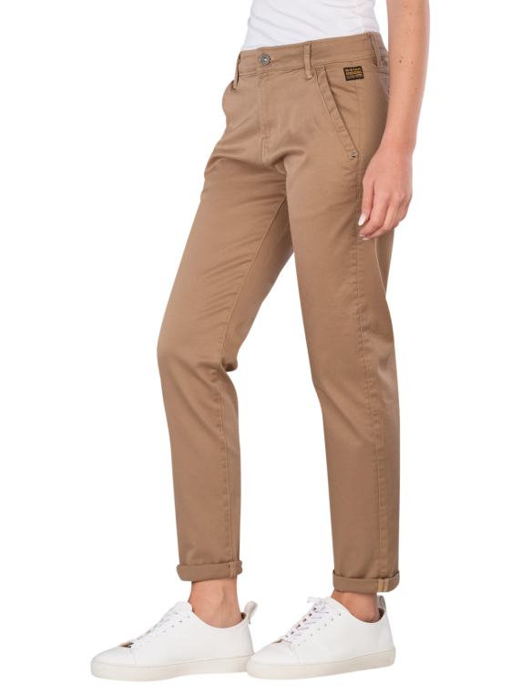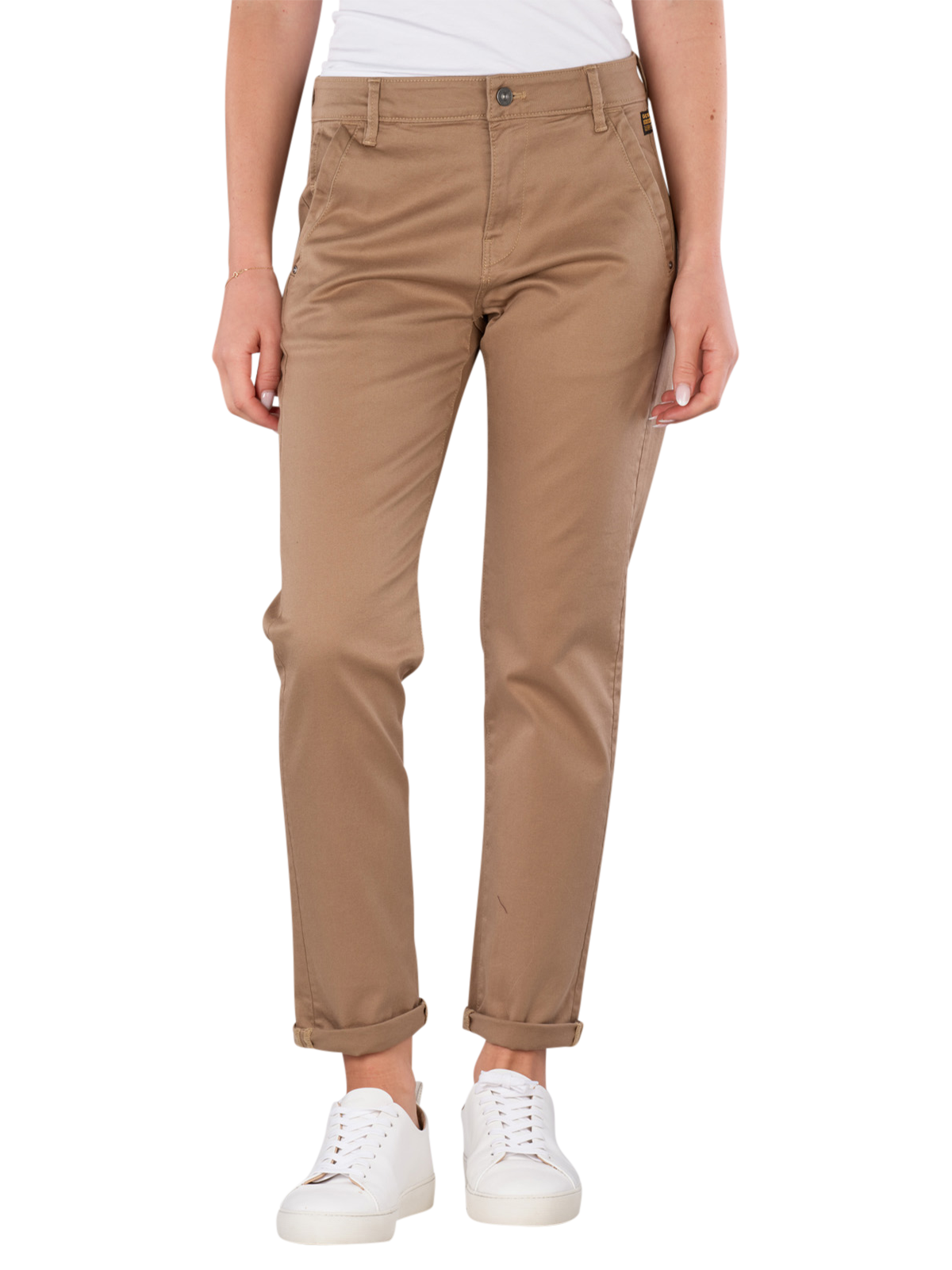 The G-Star Kate Chino Boyfriend features a straight leg cut and a mid-rise waist. The pants in brown/beige combine a relaxed boyfriend fit with a practical five-pocket design. The stretch content ensures freedom of movement and comfort. They are suitable for various leisure activities and can be combined in many ways. Easy to care for at 30°C in a normal wash cycle, they are a practical choice for everyday wear.