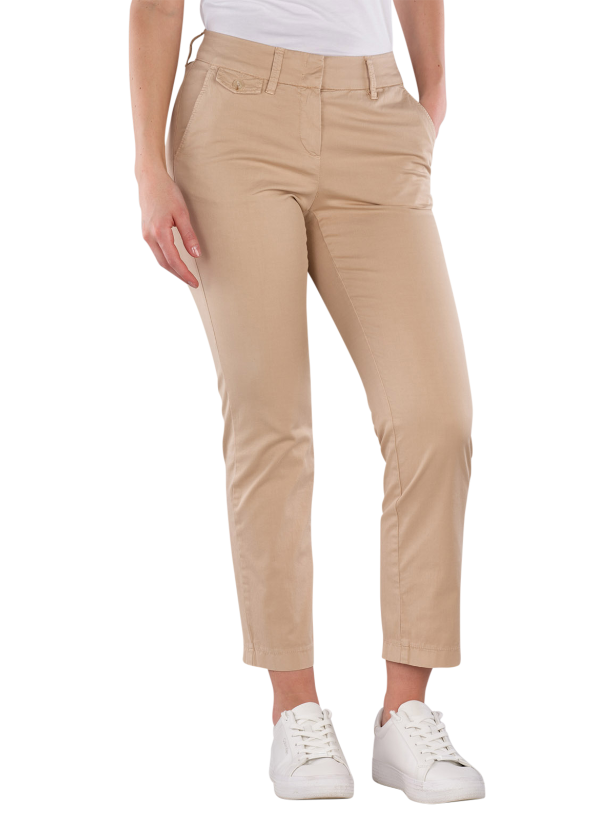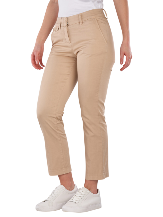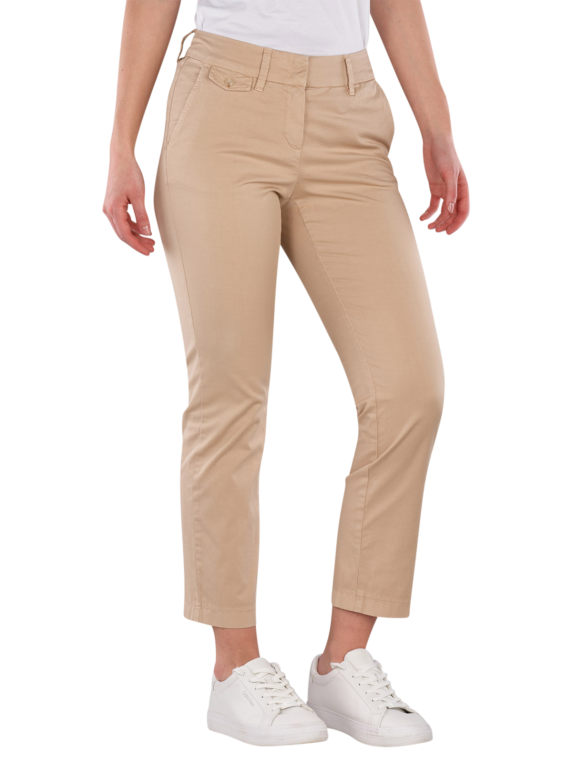 The Gardeur Denise-15 Chino Straight Fit offers a straight fit with a low to mid-rise waist. The beige pants are designed for women and are suitable for various occasions. They feature a zipper and a stretch component that provides additional comfort. The 7/8 length and the thin fabric make them a lightweight choice for spring and summer. Easy to care for in a gentle wash cycle at 30°C.