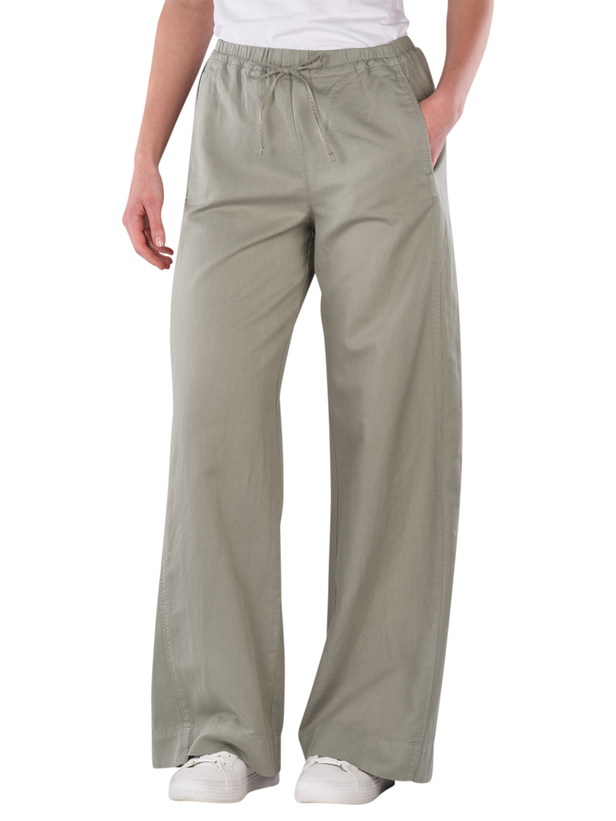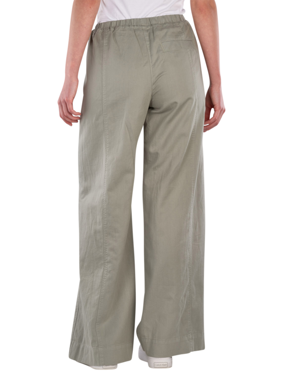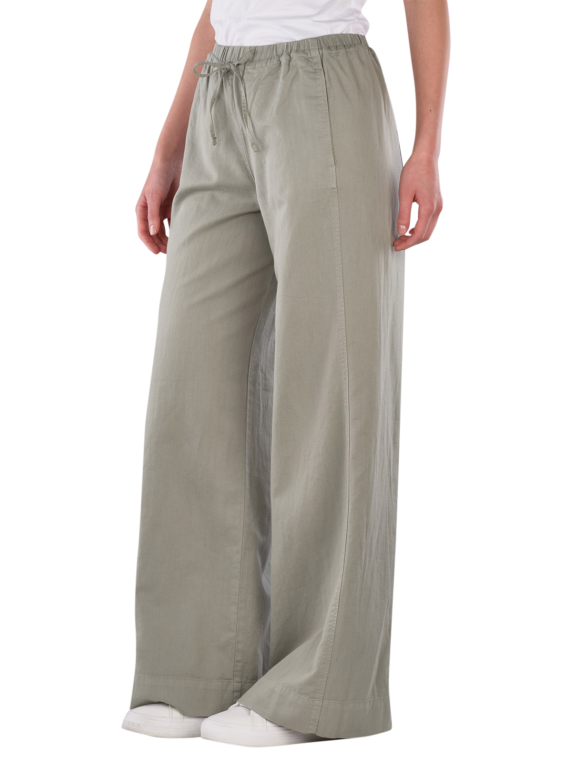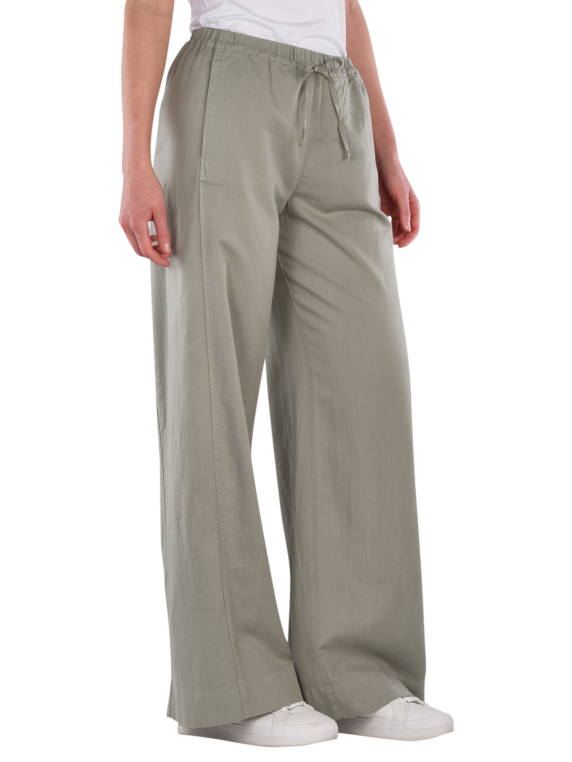 The Marc O'Polo Pants Wide Leg Back Pocket Fresh Sage offer a wide leg cut and a medium rise. The olive-colored pants are designed for women and feature an elastic waistband. They are suitable for relaxed casual looks and can be combined in various ways. The thin fabric ensures comfortable wear, while the combination of organic cotton, lyocell, and linen provides breathability.