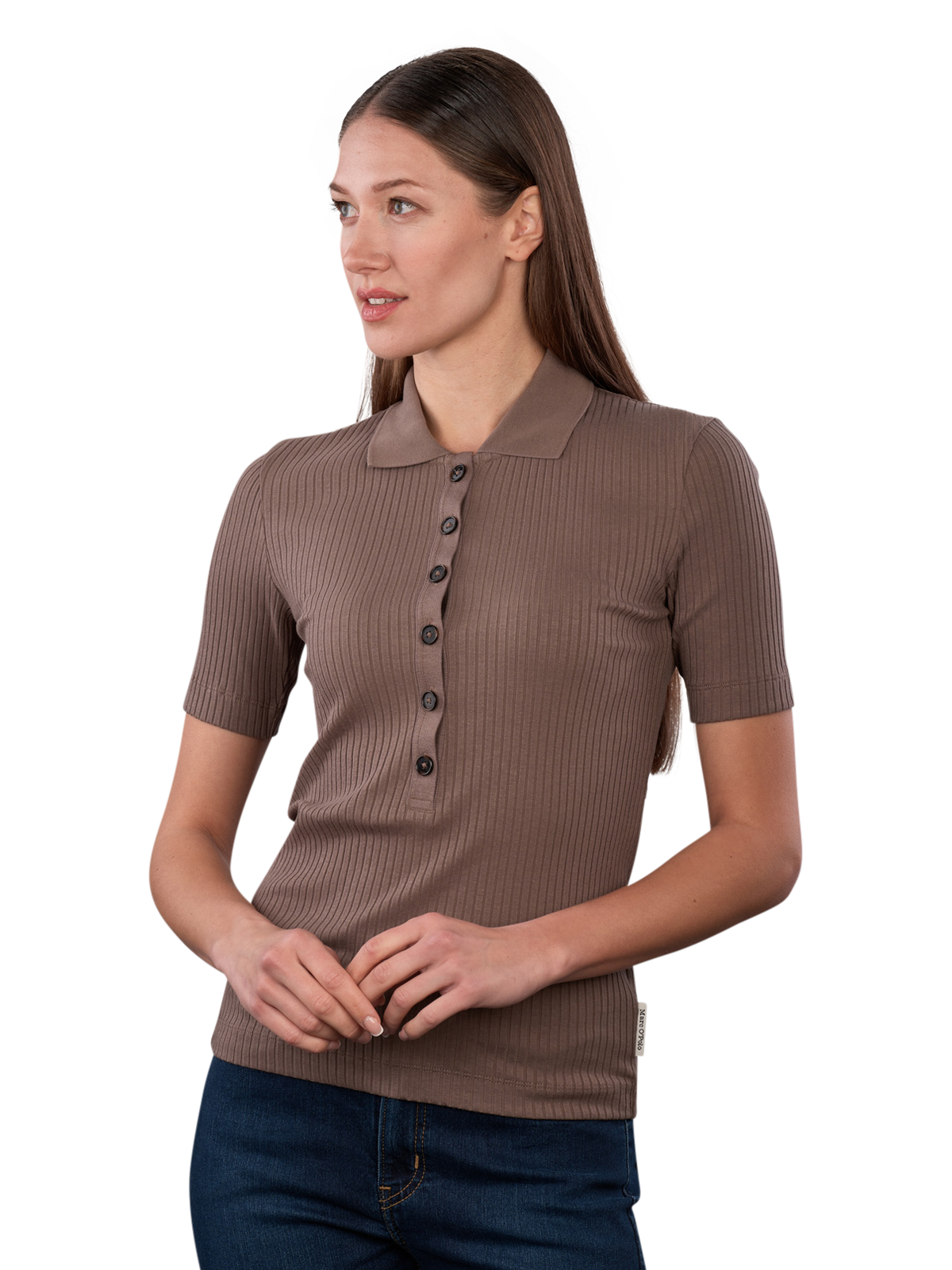 The Marc O'Polo Polo Shirt Short Sleeve in Chalky Brown features a classic polo collar and short sleeves. It is easy to care for and can be washed at 30°C on a gentle cycle. The combination of cotton, modal, and elastane provides pleasant wearing comfort and a good fit. This polo shirt is suitable for various leisure activities and can be combined in many ways.