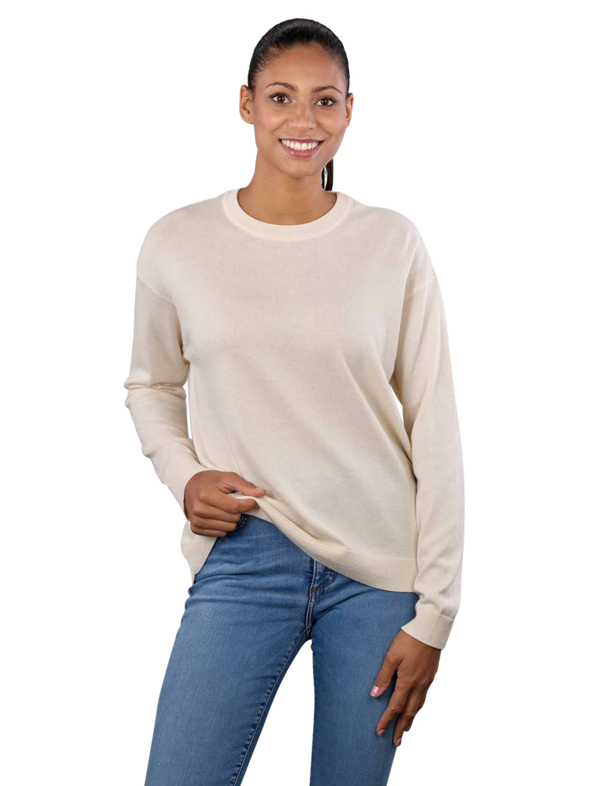 The Armedangels Lailaa pullover is a stylish round neck jumper in the colour ecru, specially designed for women. Made from a high-quality blend of 50% cotton and 50% lyocell, it offers optimum comfort. The jumper is hand washable and should not be bleached. With its minimalist design, it goes perfectly with any outfit and is a must-have for any wardrobe. Ideal for the conscious fashionista.