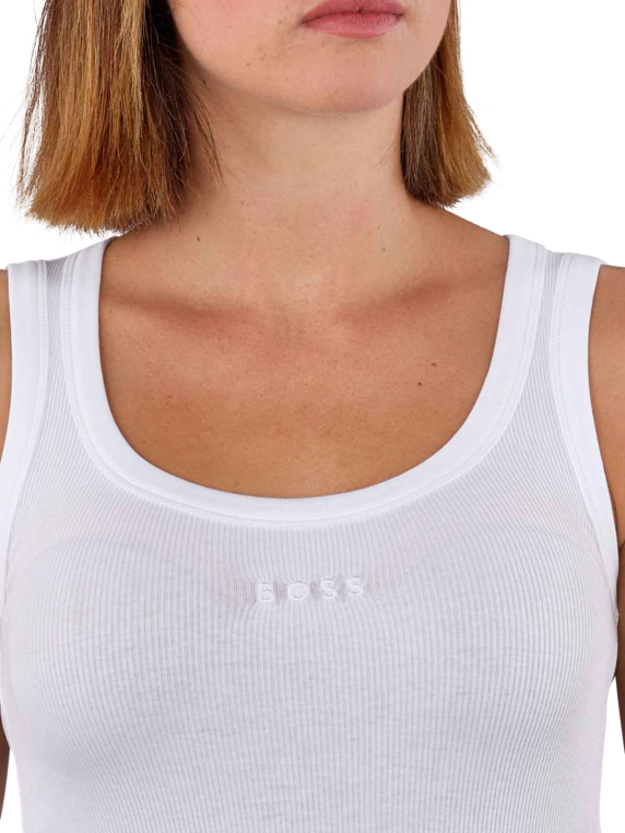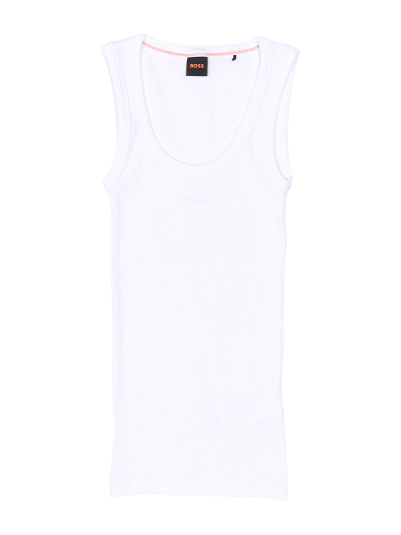 The Boss Orange C-Ematite tank top in white is a stylish T-shirt for women. It has a round neck collar and is made from 98% cotton and 2% elastane. The top should be washed on a gentle cycle at 30°C and should not be bleached. It is part of the Better Boss collection and offers great comfort and a perfect fit, ideal for casual and fashionable looks.