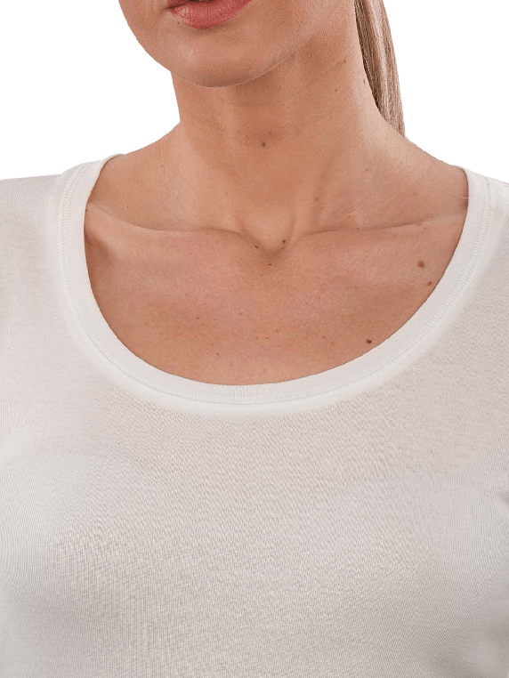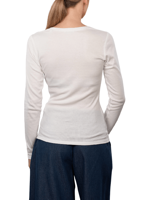 The Opus Sorana T-Shirt Longsleeve Slim Fit in the color white features a round neckline and a slim fit, making it suitable for various occasions and versatile to combine; the care instructions recommend a gentle wash at 30°C and no bleaching; the shirt is made from a blend of 50% cotton and 50% modal, ensuring pleasant wearing comfort; eco and fair standards are adhered to.