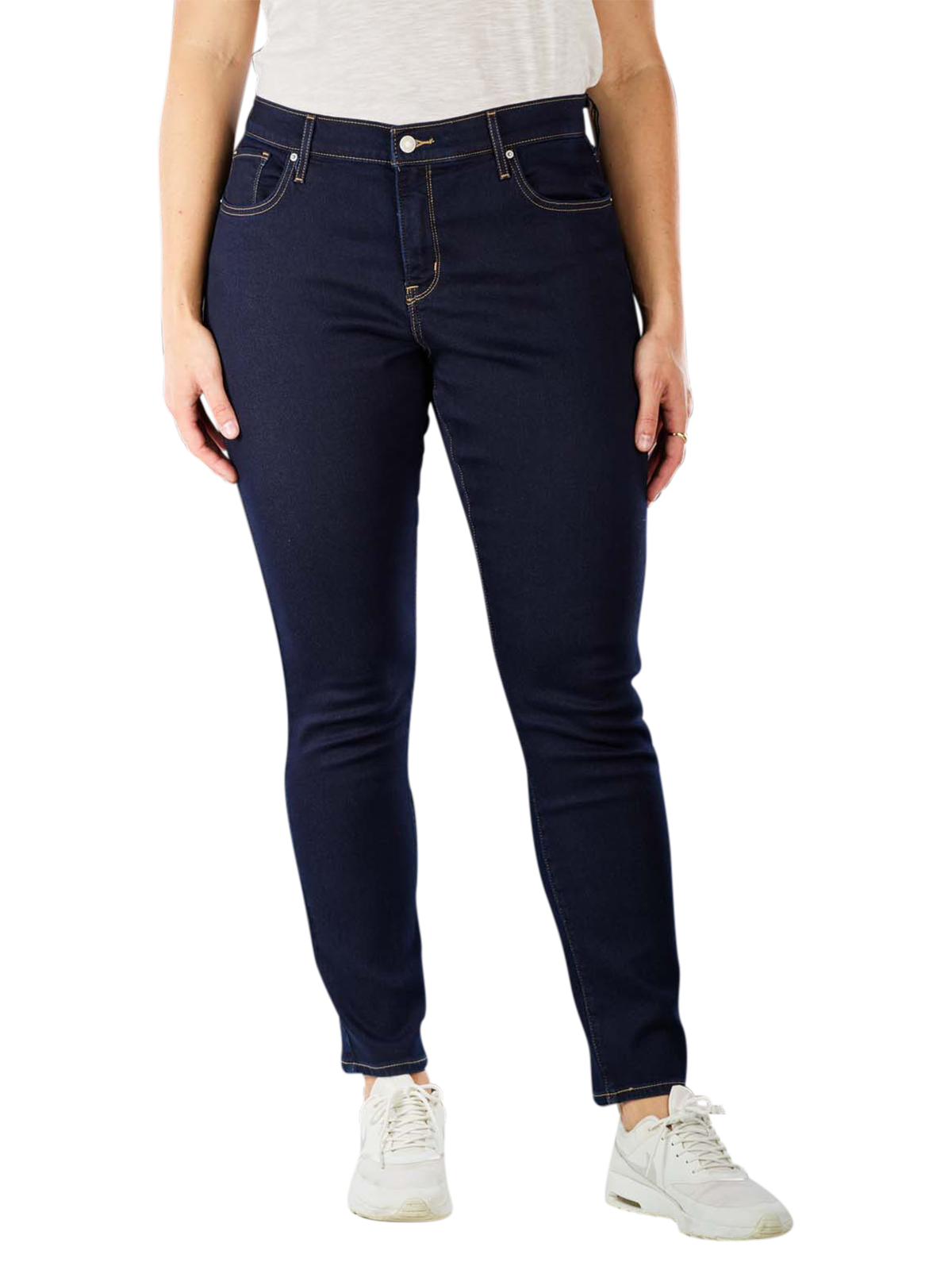 Le Levis 311 Jeans Shaping Plus Size Skinny Fit est disponible dans une couleur bleu foncé avec des coutures contrastées. En coupe skinny très ajustée. La taille est mi-haute. Le jean a un pourcentage élevé en matière élastique et se ferme par une fermeture éclair et un bouton.