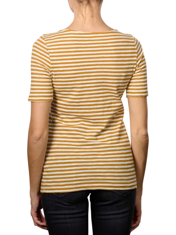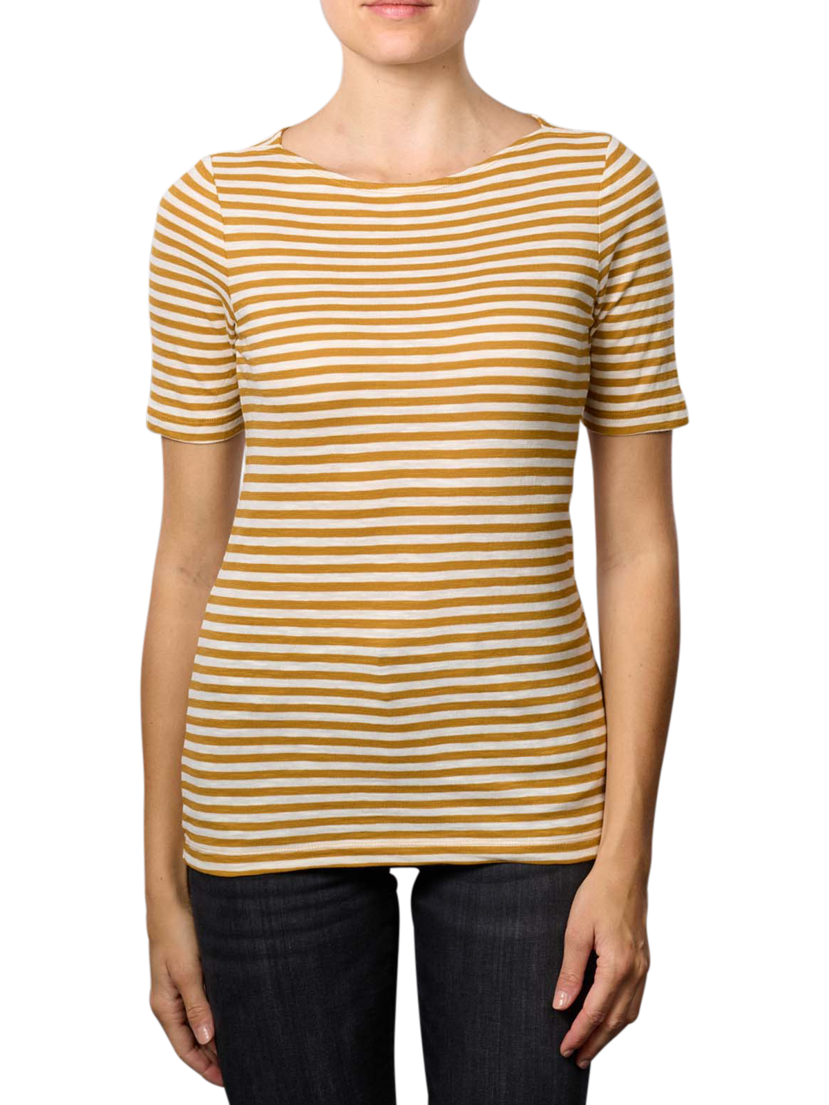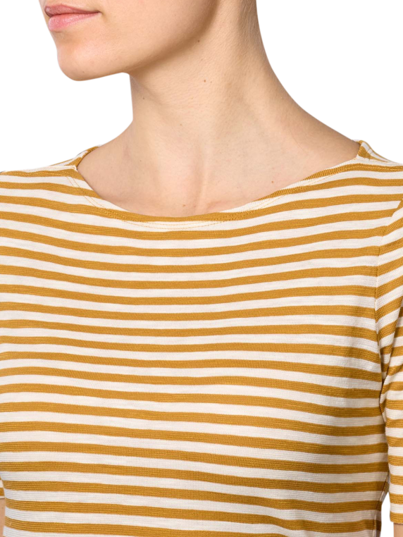 Tee-shirt ultra-décontracté pour femme. Entièrement en coton, il présente une coupe slim, confortable et féminine. Le t-shirt présente un décolleté bateau féminin et des rayures flammées verticales. C'est un t-shirt fait en tissu doux aux manches courtes.