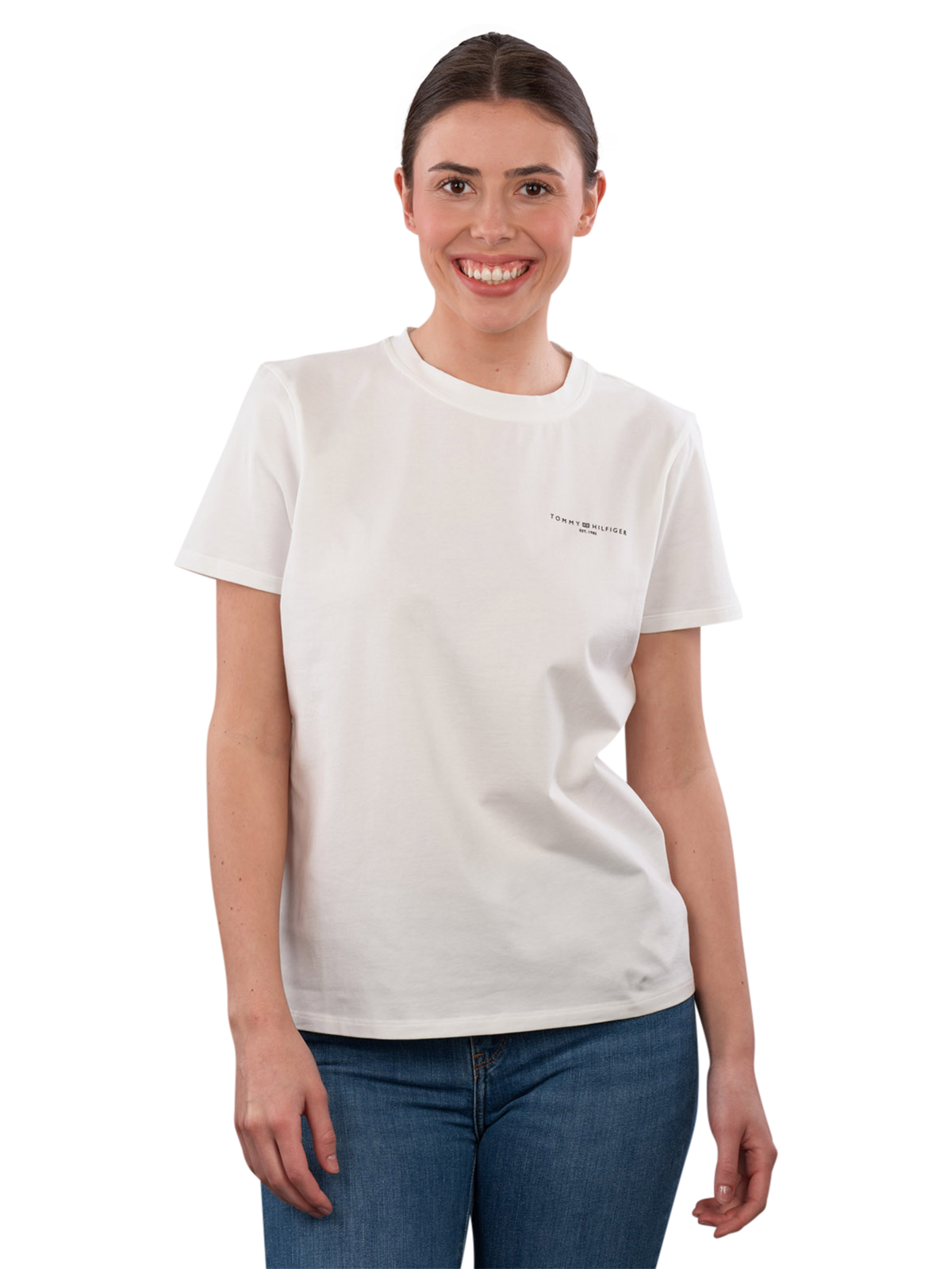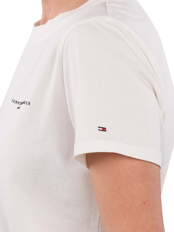 Le T-shirt Tommy Hilfiger 1985 Regular Fit en Ecru offre un col rond classique et une coupe confortable pour les femmes. Fabriqué à 95 % en coton et 5 % en élasthanne, il assure un grand confort et une liberté de mouvement. Il est facile d'entretien et peut être lavé à 30 °C en cycle délicat. Ce T-shirt convient bien pour des tenues décontractées et se combine de manière polyvalente.