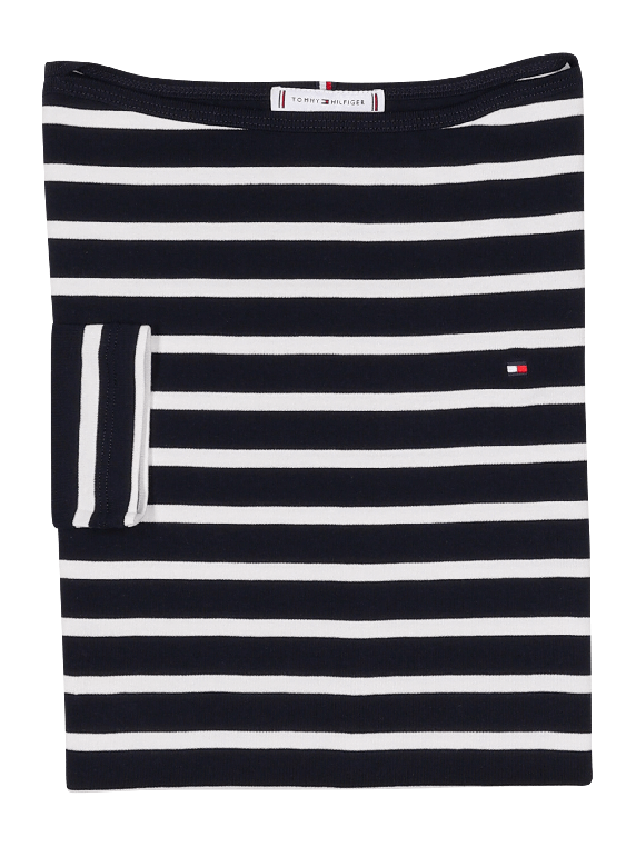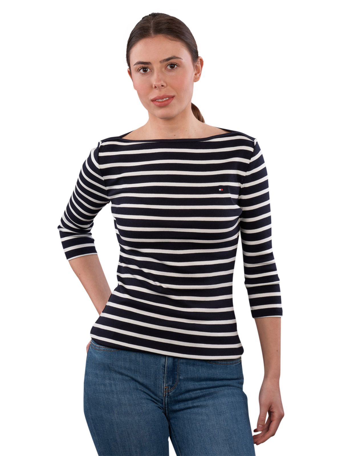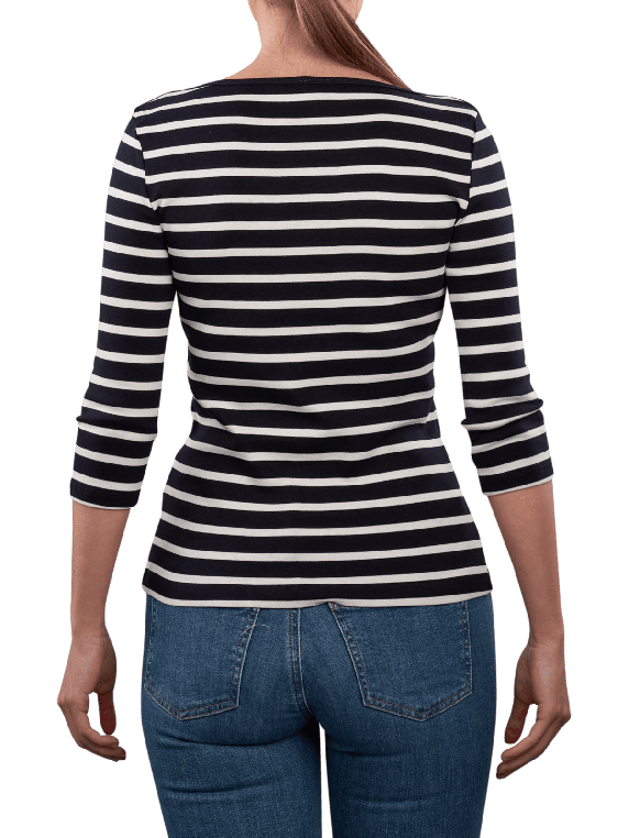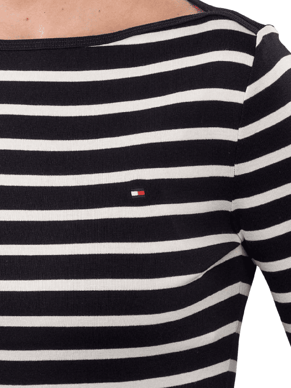 Le T-shirt Tommy Hilfiger Cody à manches 3/4 en bleu foncé offre un col bateau pour un look moderne. Il est fabriqué en 100 % coton et convient au lavage en machine dans un cycle délicat à 30 °C. L'utilisation de coton régénératif soutient des pratiques durables. Ce T-shirt se combine de manière polyvalente et offre un grand confort de port.