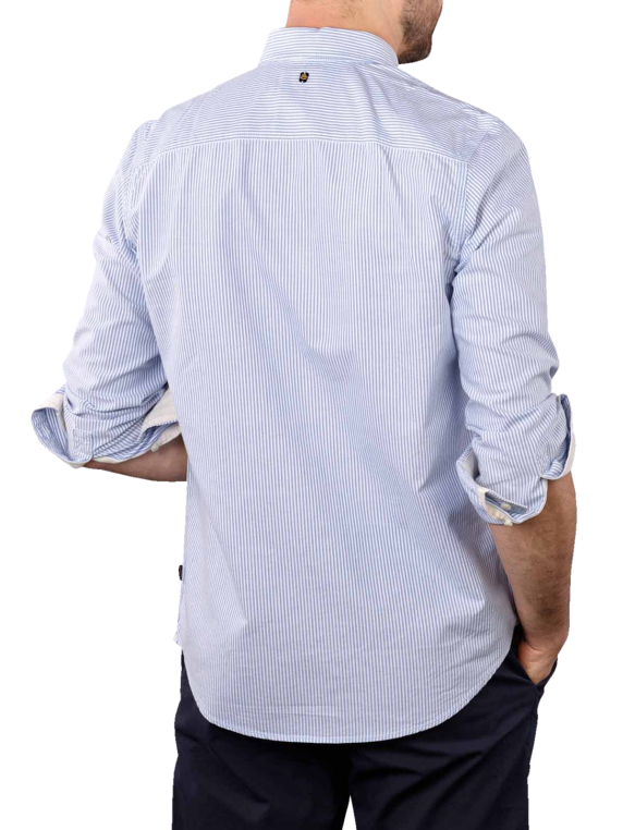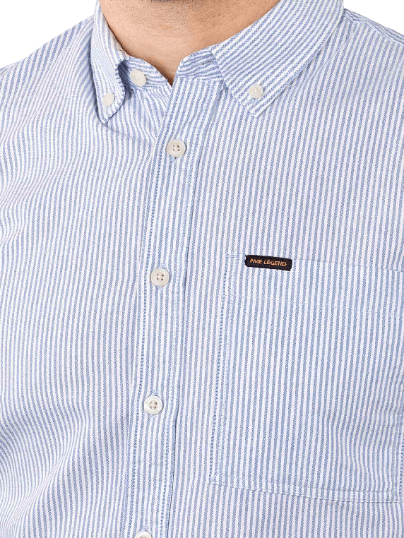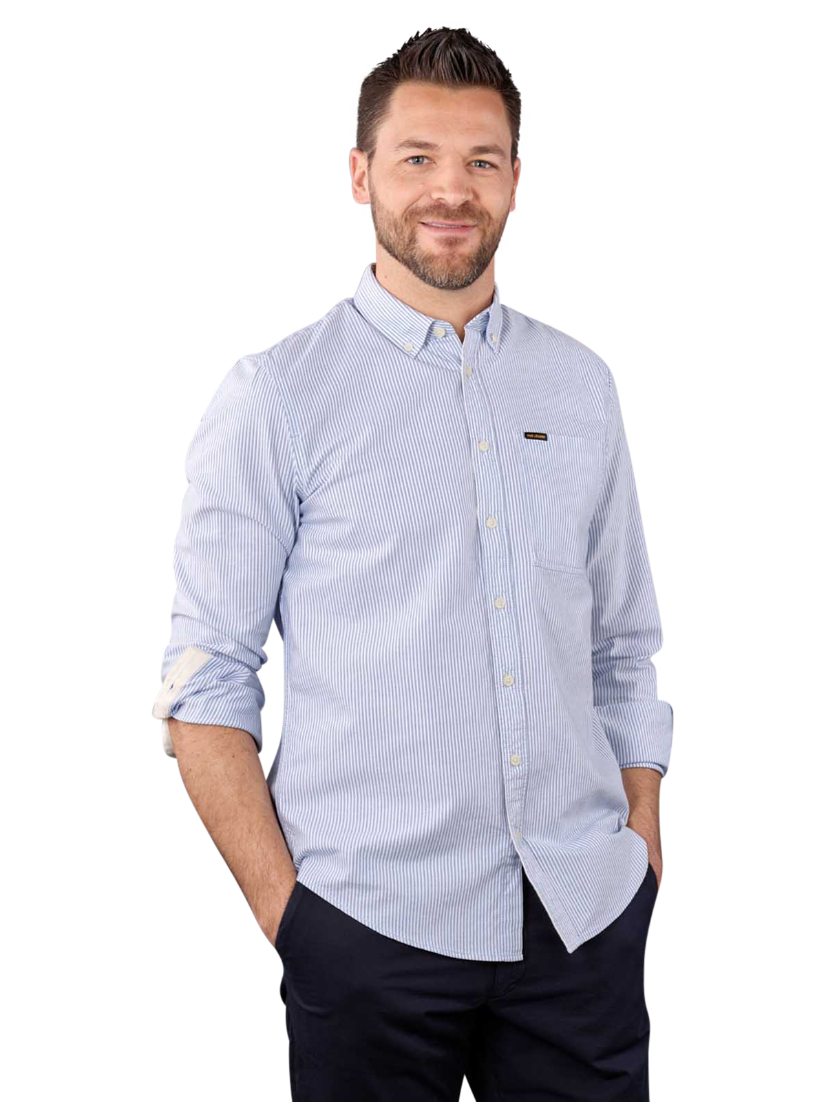 La PME Legend Long Sleeve Shirt Striped Oxford est une chemise à manches longues à rayures pour hommes dans la couleur Placid Blue, composée à 100 % de coton. Elle possède une poche sur la poitrine et convient à un style décontracté. Le logo de la marque est bien visible sur la chemise.
