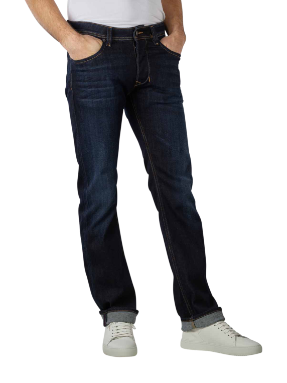Le jeans bleu foncé et tendance à cinq poches avec une agréable part de stretch de la marque de jeans mondialement connue se ferme avec une jolie patte de boutonnage. Avec sa coupe droite classique et sa taille basse, la marque de jeans pose des jalons forts en matière de mode. Les cuisses droites ainsi que l'échancrure droite des jambes représentent la nouvelle ligne du revival classique.