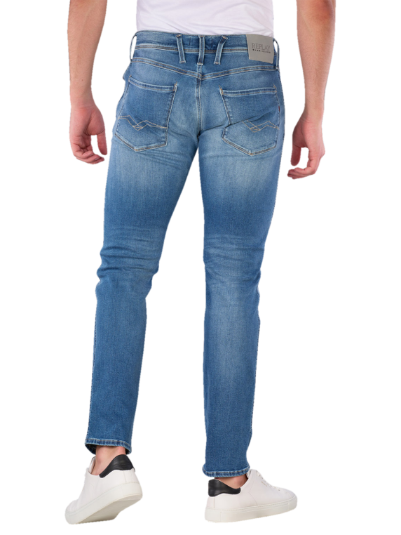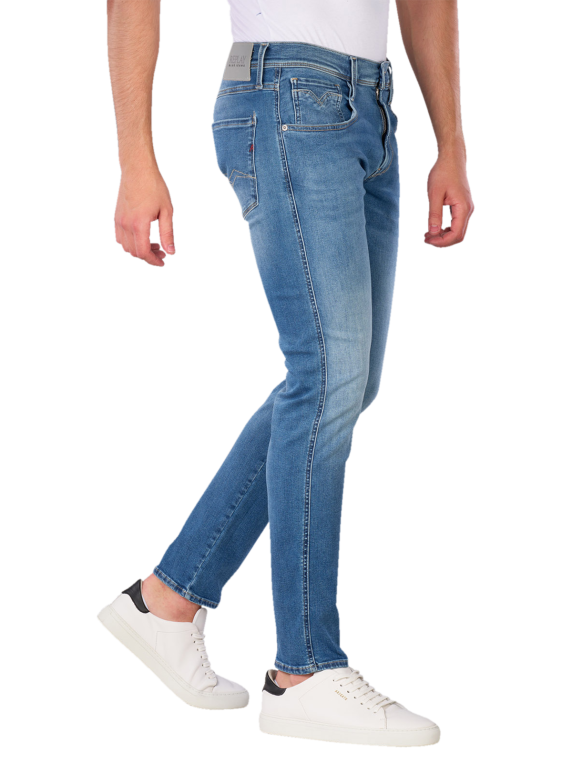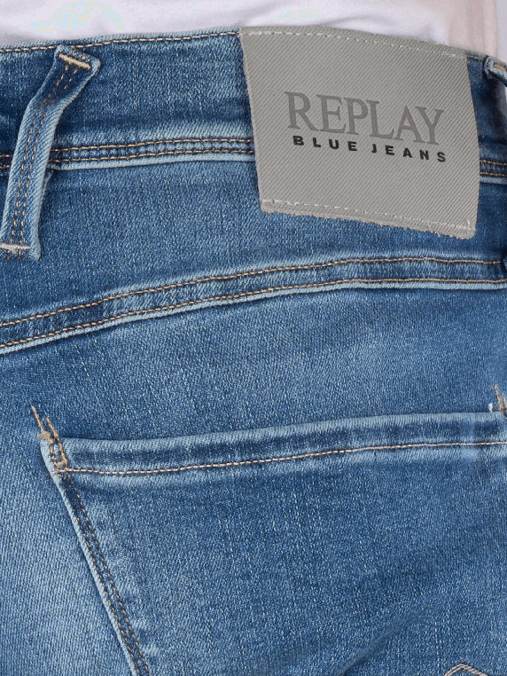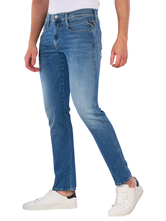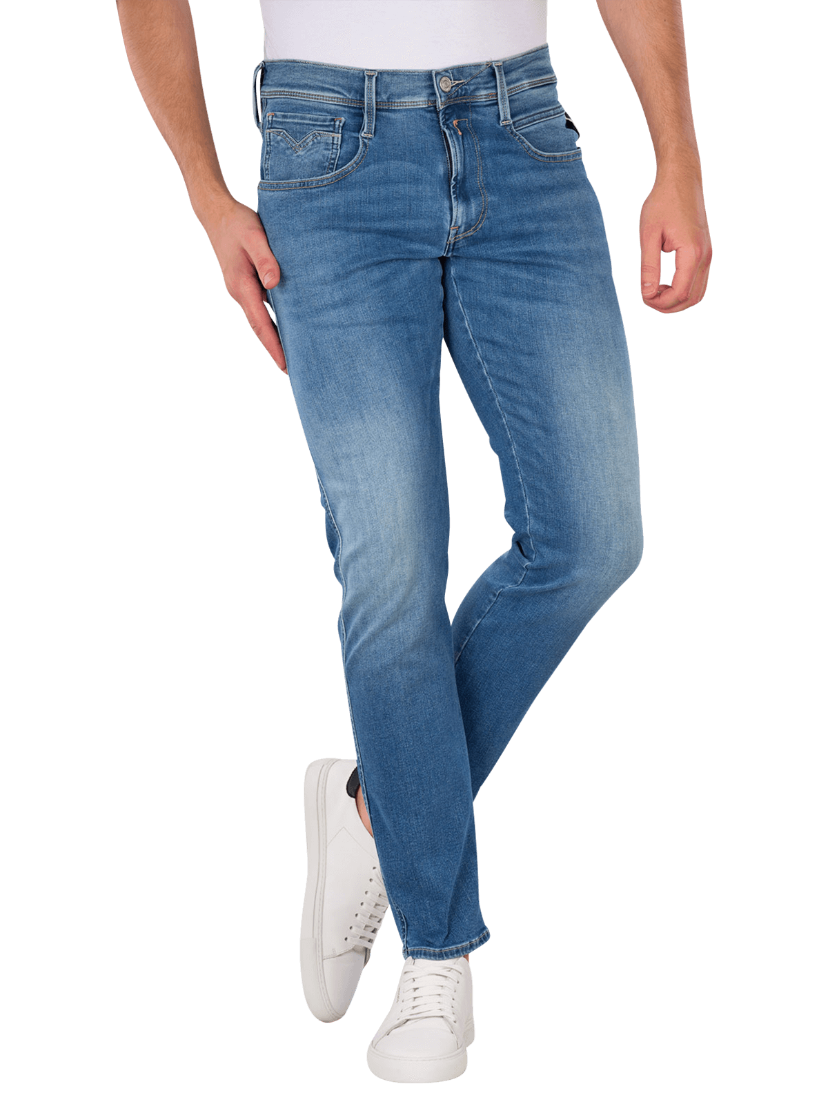 Les jeans Replay Anbass Slim Fit en bleu clair/bleu moyen offrent une coupe moderne avec une jambe étroite et une taille moyenne. Ces jeans à cinq poches sont équipés d'une fermeture éclair et disposent d'une part d'élasthanne pour un confort optimal. Le lavage clair à moyen donne un look décontracté. Idéal pour le quotidien ou les activités de loisirs, se combinant avec différents hauts.