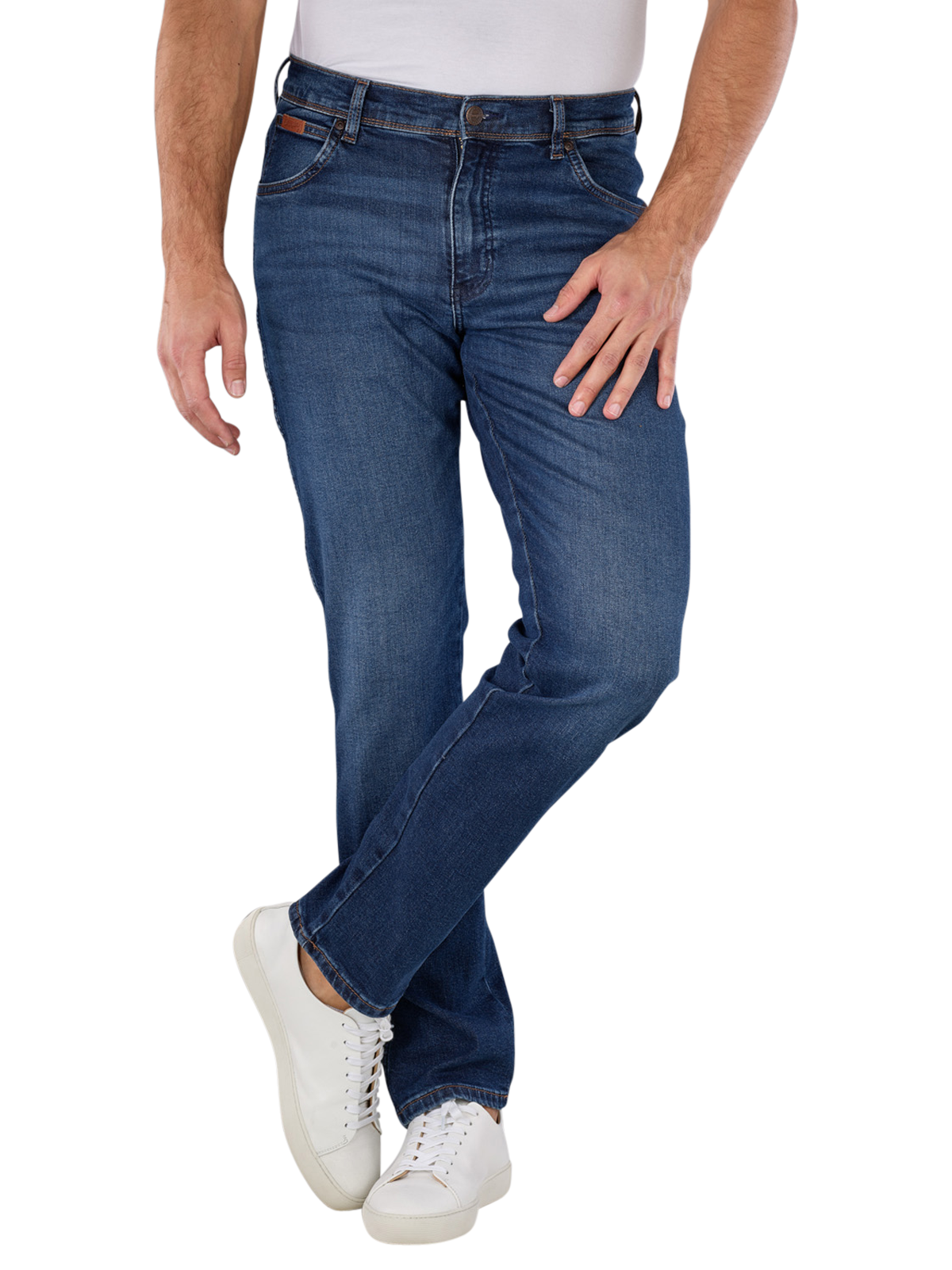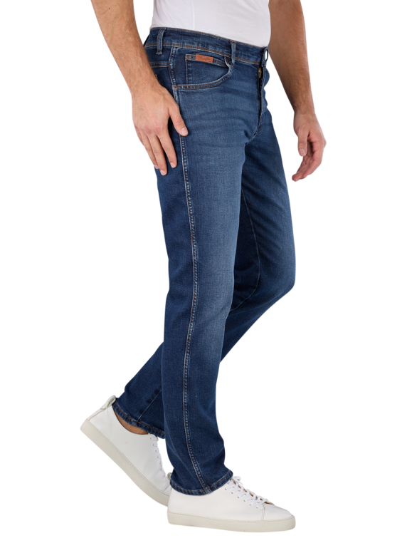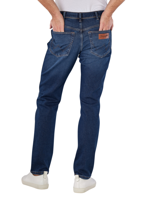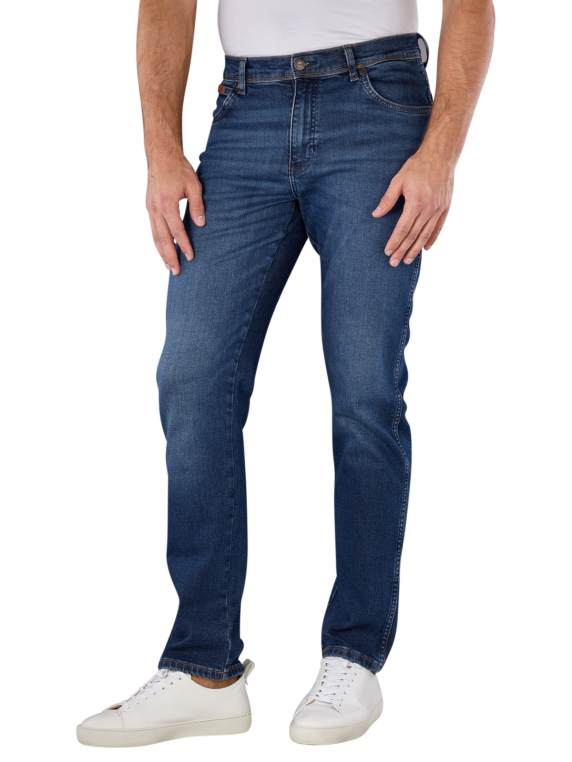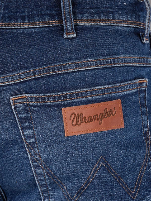 Les jeans Wrangler Texas Slim Fit en Dark Trails sont des jeans bleus moyens pour hommes avec une taille moyenne à haute et une coupe de jambe droite et étroite. Ils offrent une combinaison de coupe droite et de coupe slim et sont composés de 91% de coton, 8% de polyester et 1% d'élasthanne avec un pourcentage de stretch. Le pantalon dispose d'une fermeture à glissière, d'une construction à cinq poches et d'un lavage moyen. Entretien facile à 30°C sur un cycle de lavage normal.