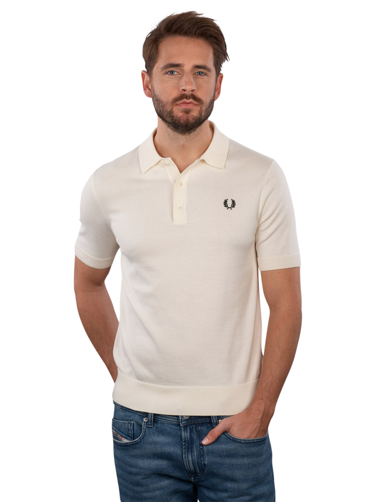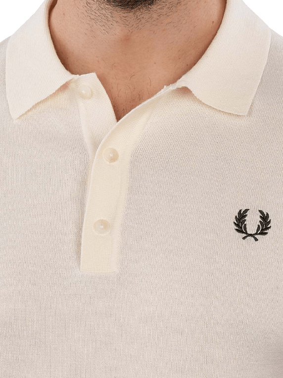 Le Fred Perry Knitted Polo Shirt en Ecru offre un col polo classique et est fabriqué en 100 % coton. Il convient à diverses activités de loisirs et assure un confort de port agréable. Les instructions d'entretien recommandent un cycle de lavage délicat à 40 °C et de ne pas utiliser de javel. Ce polo combine un design intemporel avec fonctionnalité et est un ajout polyvalent à la garde-robe.