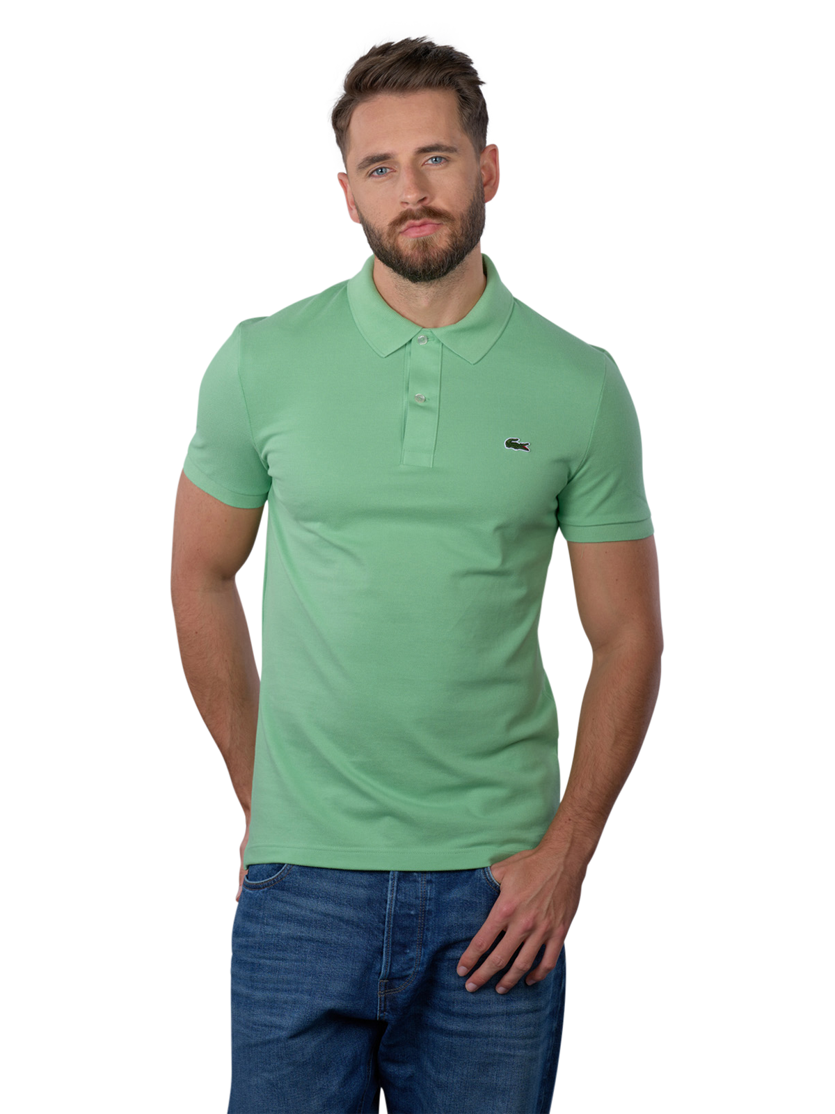 Le polo Lacoste Slim à manches courtes est spécialement conçu pour les hommes et brille dans un vert frais. Il appartient à la catégorie des polos et se distingue par son col polo classique. Fabriqué à 100% en coton, il est très agréable à porter. Il doit être lavé à une température maximale de 30 degrés et ne doit pas être blanchi afin de préserver l'intensité des couleurs et la qualité du matériau. Un compagnon élégant pour de nombreuses occasions.