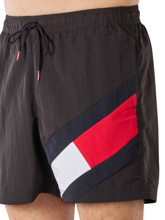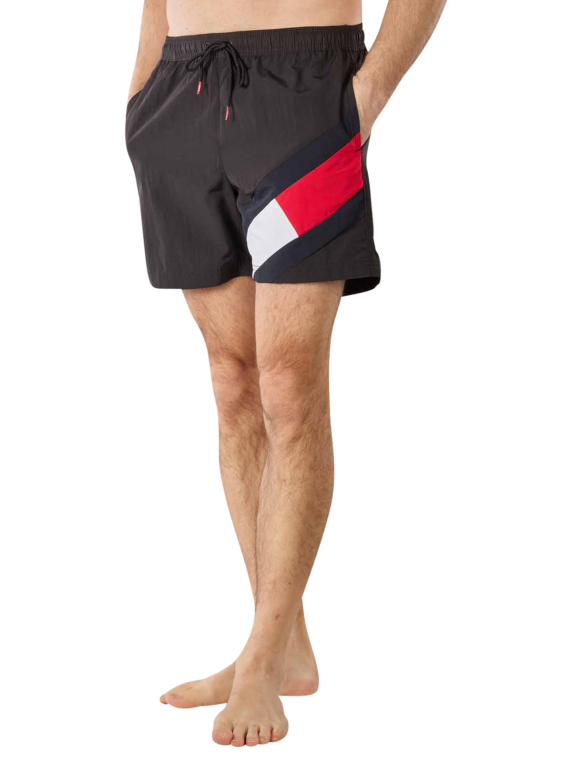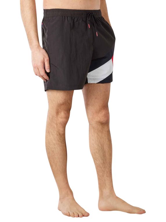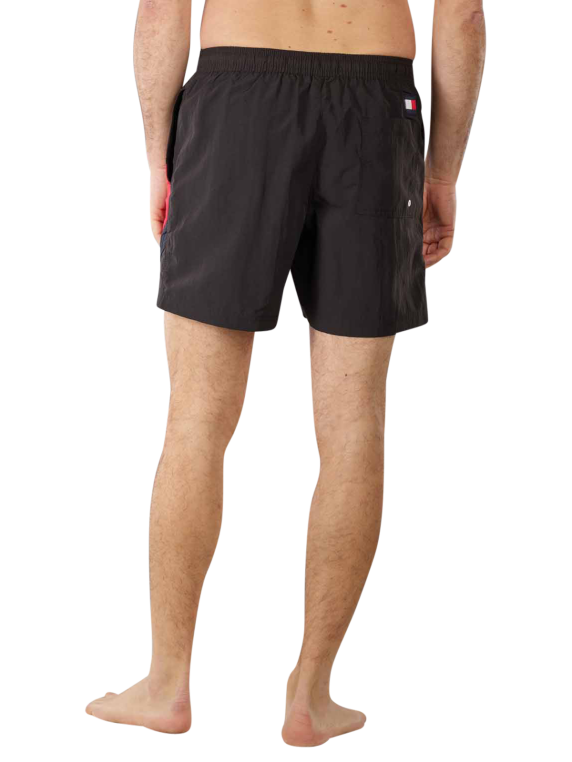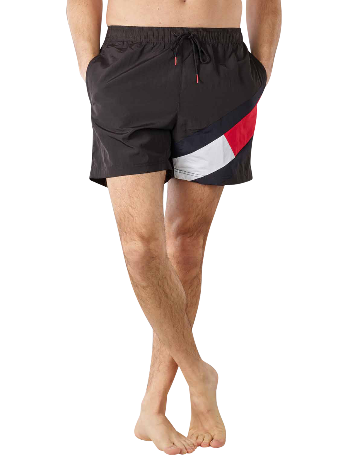 Le short de bain de la marque tendance Tommy Hilfiger, de couleur noire, est fabriqué à partir de matériaux recyclés. Les rayures proéminentes en blanc et rouge sur la jambe gauche du pantalon attirent le regard. Le short a une coupe confortable, la jambe est plutôt large. Une ceinture élastique avec cordon de serrage assure une tenue optimale. Le maillot de bain peut être lavé à 30 degrés et peut également être séché au sèche-linge.