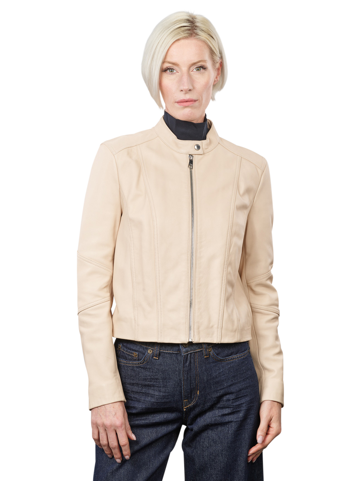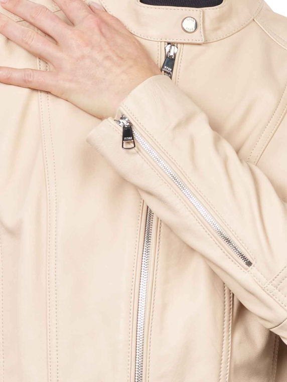 Die helle beigefarbene Lederjacke des Trendlabels Boss überzeugt durch hohe Qualität und legerem Tragekomfort. Die kurze Lederjacke auf Hüfthöhe im Bikerstil ist gefüttert und unifarben. Eine Jacke aus 100 % Leder, welche figurbetont am Körper sitzt und gleichzeitig durch interessante Nahtverläufe am Rücken besonders interessant wirkt. Die Lederjacke wir mit einem Reissverschluss und einem Metallknopf verschlossen.