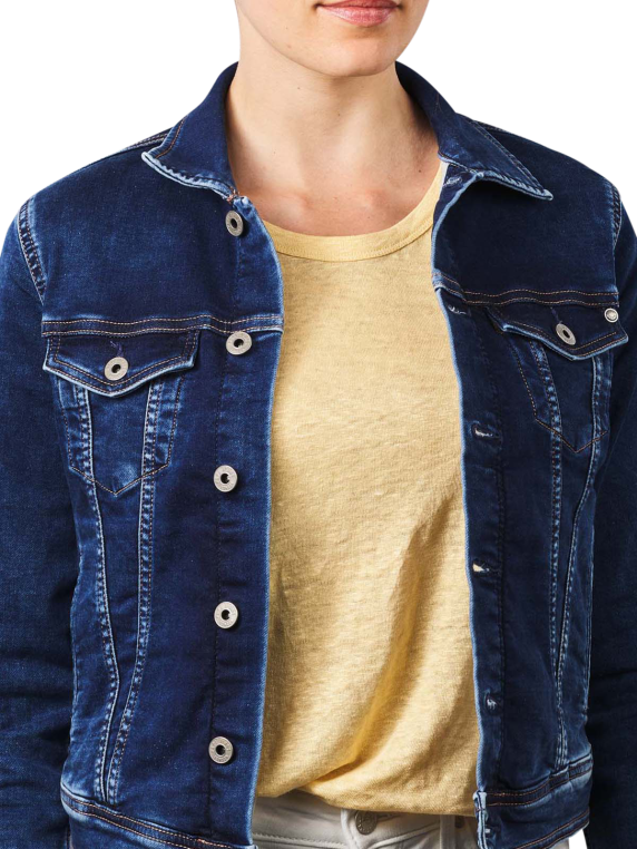 Die Pepe Jeans Core Jacket Denim HG4 ist eine leichte Jeansjacke. Ihr taillierter kurzer Schnitt betont die Figur. Sie endet auf dem Gesäss, hat lange Ärmel und die klassischen Formnähte auf der Vorderseite. Verschlossen wird sie mit einer Knopfleiste mit grossen Logoknöpfen. Das Gleiche gilt für die beiden kleinen Brusttaschen.