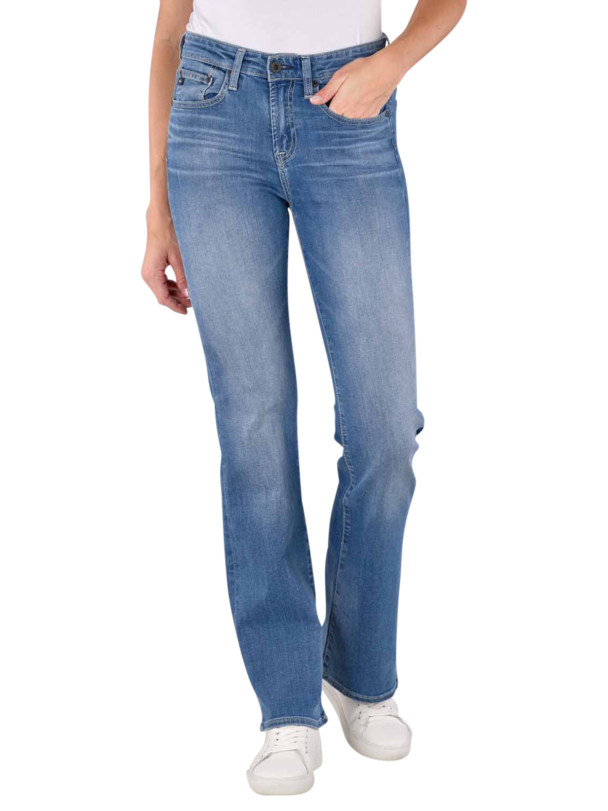 Die AG Jeans Sophie Boot verfügt über einen weiten Beinausschnitt, gerade Oberschenkel und einen hohen Bund. Sie ist mittelblau, die Passform wird mit Bootcut angegeben. Die Jeans hat einen Stretchanteil und wird mit einem Reissverschluss geöffnet und geschlossen. Es handelt sich um eine Five-Pocket-Hose im Casual-Stil. Als Material werden 86 % Baumwolle, zwei % Elasthan und 12 % Polyester eingesetzt.