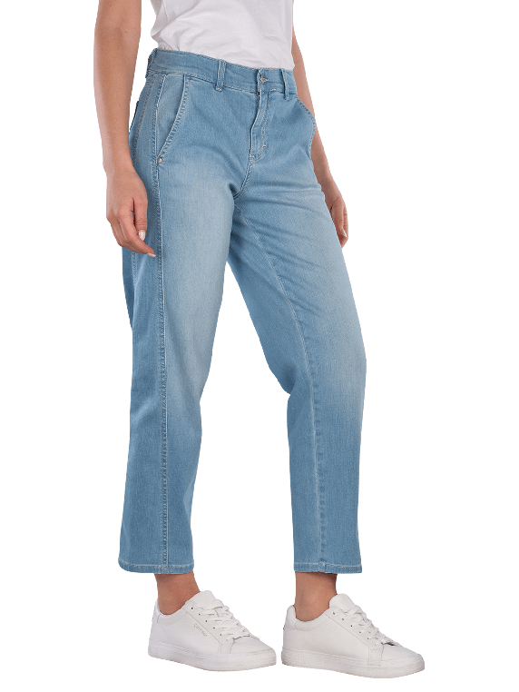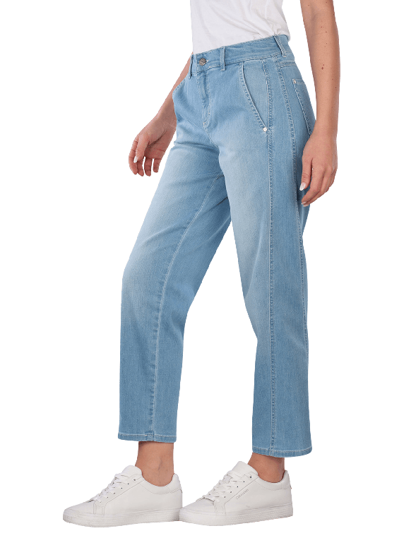 Die Angels Evy Galon Jeans im Barrel Fit bietet eine gerade Beinausschnitt und eine mittlere Bundhöhe. Die hellblaue Waschung verleiht einen frischen Look. Mit einem Stretchanteil sorgt sie für hohen Tragekomfort und Bewegungsfreiheit. Die Five-Pocket-Design ermöglicht praktischen Stauraum. Diese Jeans ist für den Schonwaschgang bei 30°C geeignet und entspricht umweltfreundlichen Standards.