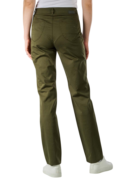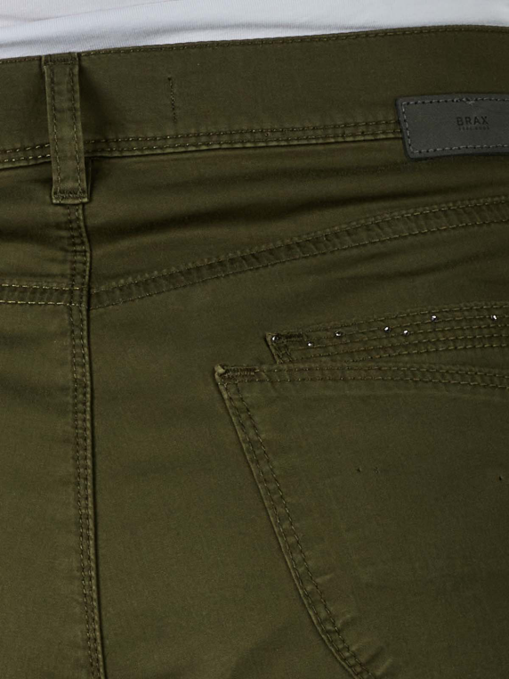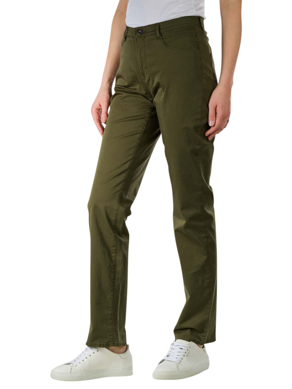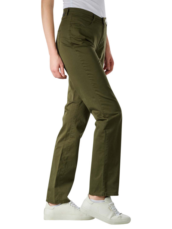 Die Brax Carola Straight Fit Pants ist eine olivgrüne Hose aus 97 % Baumwolle und 3 % Elasthan (Stretchanteil). Das Produkt besteht aus einem dünnen Stoff, hat einen hoch sitzenden Bund, fünf Hosentaschen und einen Reissverschluss. Die Brax Carola Straight Fit Pants ist stilistisch sowohl dem Casual- als auch dem Business-Stil zuzuordnen und wird nachhaltig produziert (Blue Planet Label).