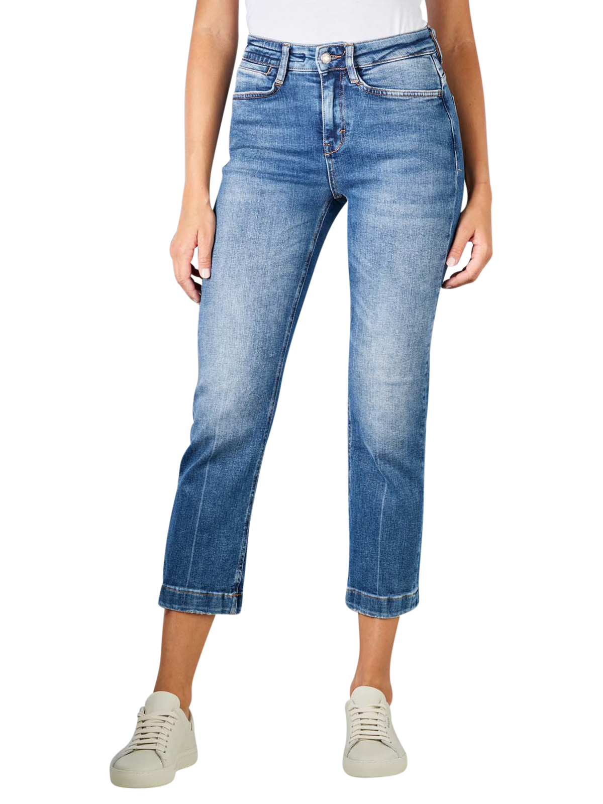 Die 7/8-Jeans für Damen in der Farbe Light Blue verfügt über Knopf und Reissverschluss und ist am Bund mittelhoch geschnitten. Der Stretch-Anteil garantiert eine angenehme Passform und verhindert ein lästiges Rutschen. Die Hose besticht durch eine Waschung im angesagten Used-Look und ergänzt jeden lockeren Freizeit-Stil perfekt.