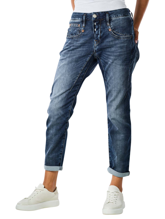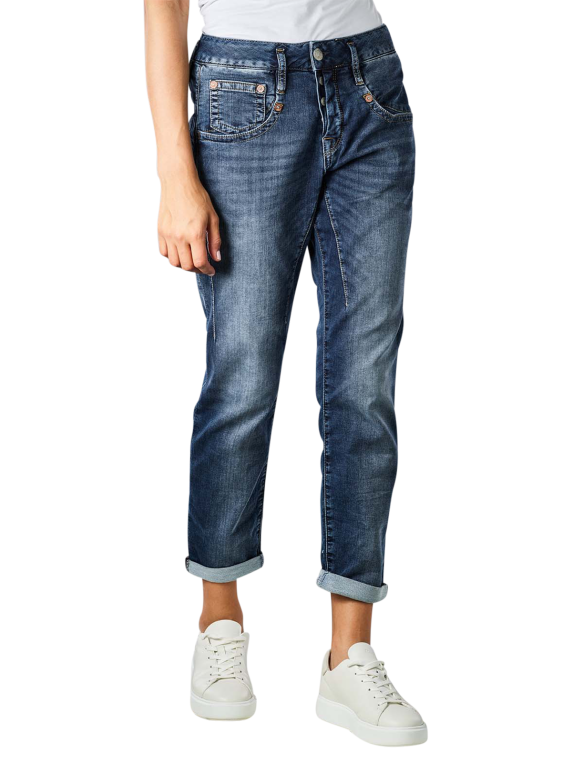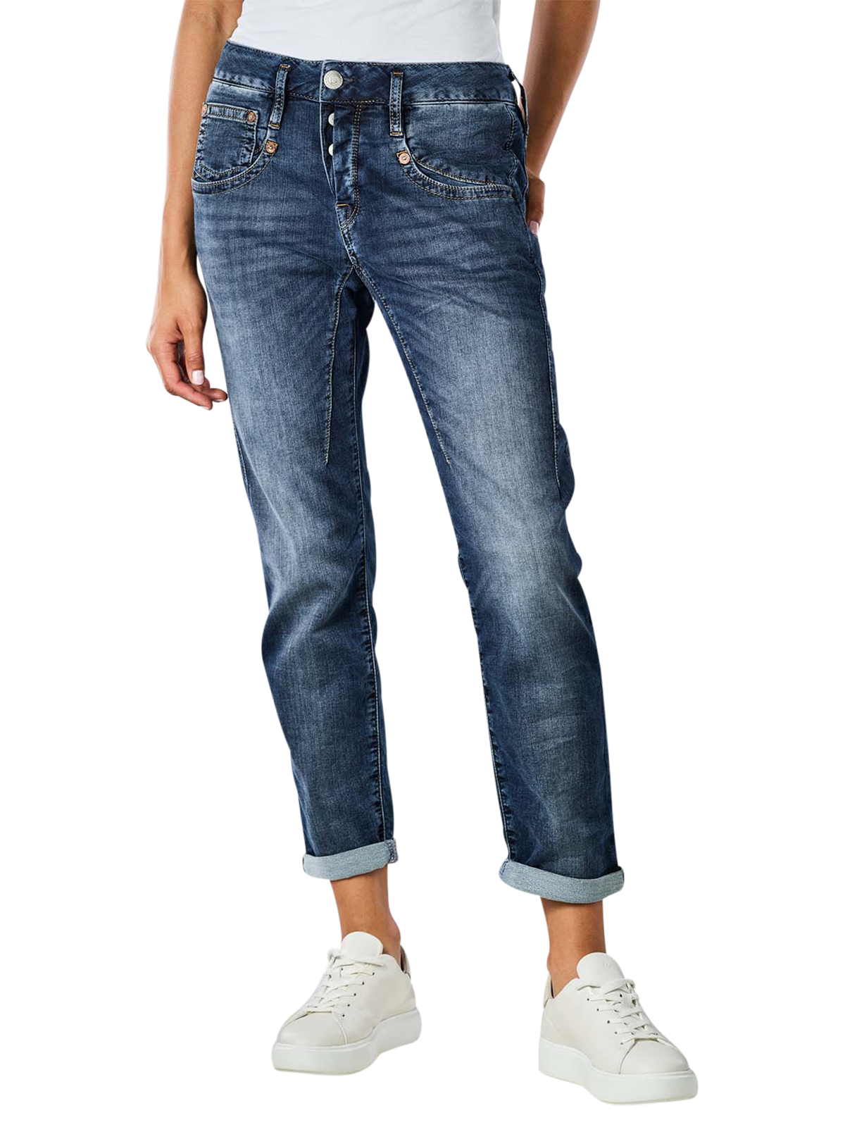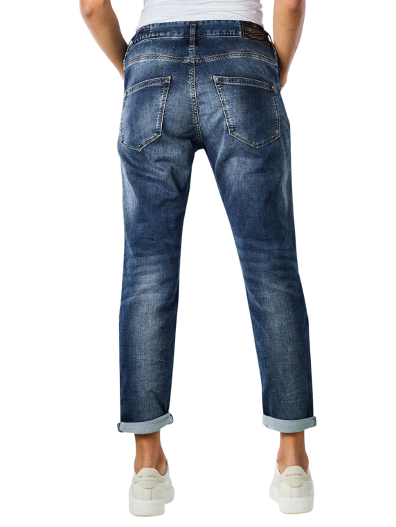 Die dunkelblaue Damen Jeans ist sowohl an den Oberschenkeln gerade, bei den Beinen jedoch eher eng geschnitten. Das Material besteht zu 90,5% aus Baumwolle, zu 8% aus Polyester und zu 1,5% aus Elasthan. Man kann die Hose bei 30 Grad Celsius waschen. Sie hat einen Casual Stil und besitzt einen hohen Bund.