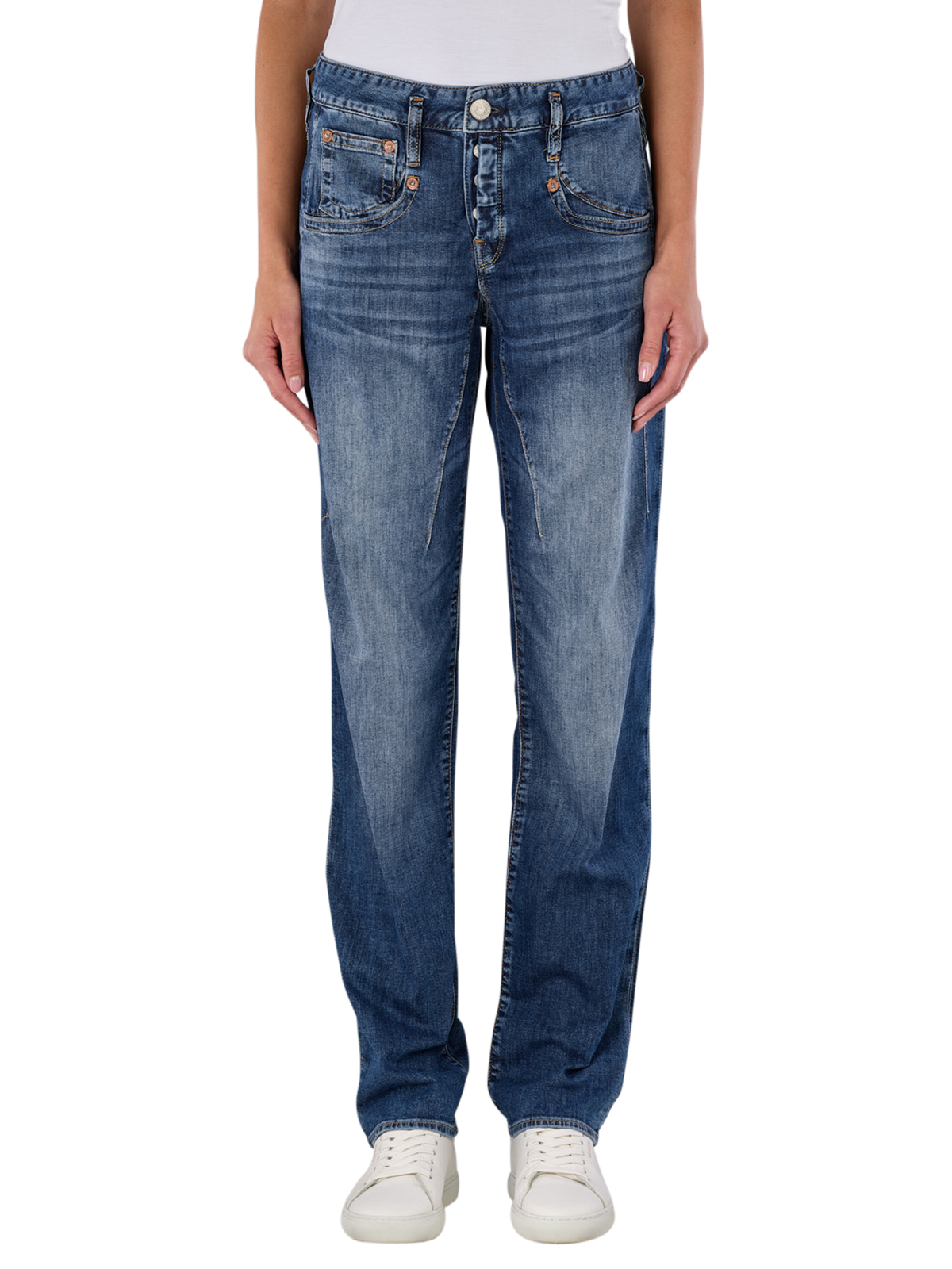 Die Herrlicher Shyra Tap Jeans in Mittelblau bietet Frauen einen bequemen Boyfriend Fit mit tapered Beinabschluss und hohem Bund. Hergestellt aus 98% Baumwolle und 2% Elasthan, sorgt die Jeans dank Stretchanteil für optimalen Komfort. Mit Standardstoffdicke und Five-Pocket-Design bietet sie vielseitige Alltagstauglichkeit. Die Knopfleiste und mittlere Waschung runden den Look ab. Pflegehinweis: Normalwaschgang bei 30 Grad, nicht bleichen.