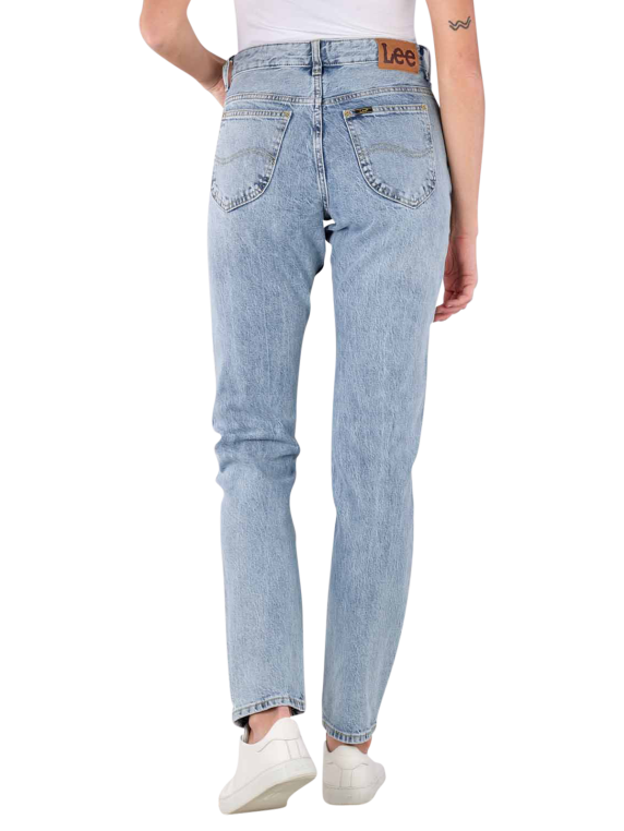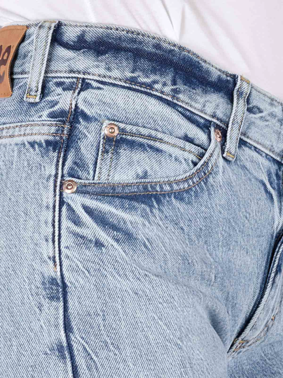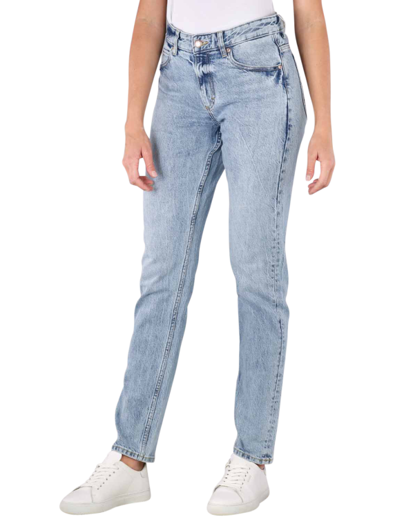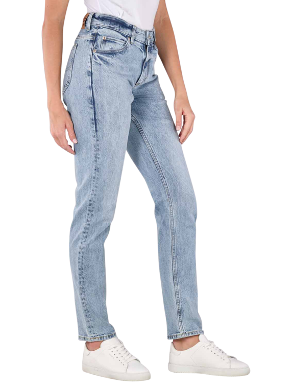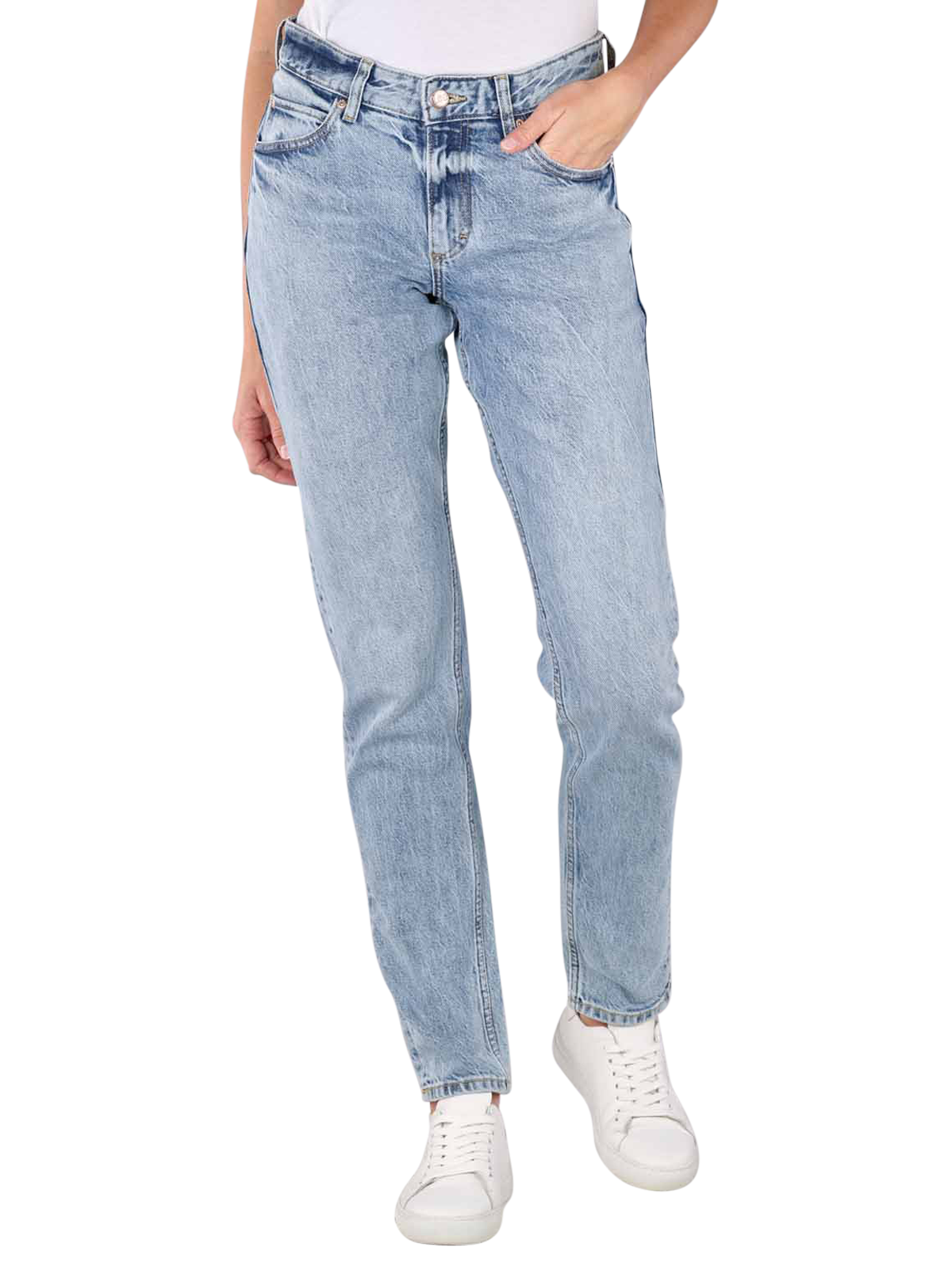 Die hellblaue Jeans in einem Mix aus Slim Fit und Straight-Fit-Form mit Reissverschluss und Stretchanteil besitzt eine mittlere Bundhöhe sowie eng anliegende Oberschenkel sowie einen geraden Beinausschnitt. Das Material besteht aus 67 % Baumwolle, 32 % Lyocell sowie 1 % Elasthan. Die Gesässtaschen sind gross und mit der bekannten Welle jeweils gesteppt.