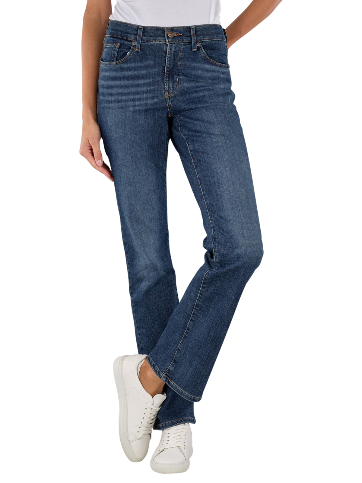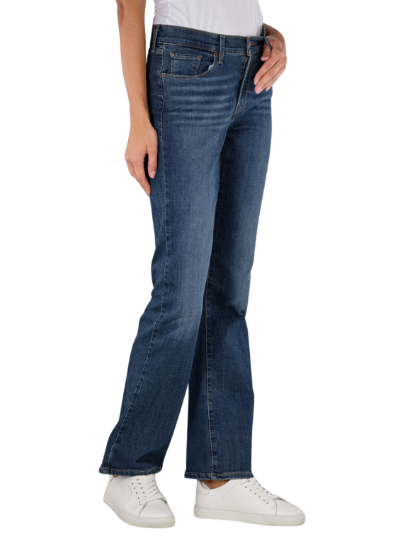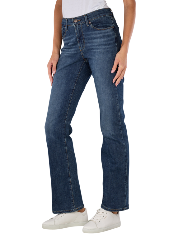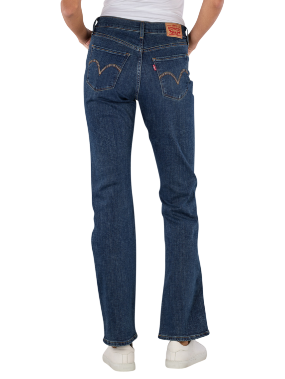 Levi's Classic Bootcut Jeans in Dunkelblau für Frauen bieten eine mittlere Bundhöhe und weiten Beinausschnitt. Die Jeans haben eine klassische Five-Pocket-Form und einen Reissverschluss. Gefertigt aus 60% Baumwolle, 23% Viskose, 16% Polyester und 1% Elasthan, bieten sie eine Standard Stoffdicke mit Stretchanteil. Die dunkle Waschung und Lapis Wave Stickerei machen sie ideal für den Alltag. Waschbar bei 30°C, nicht bleichen.