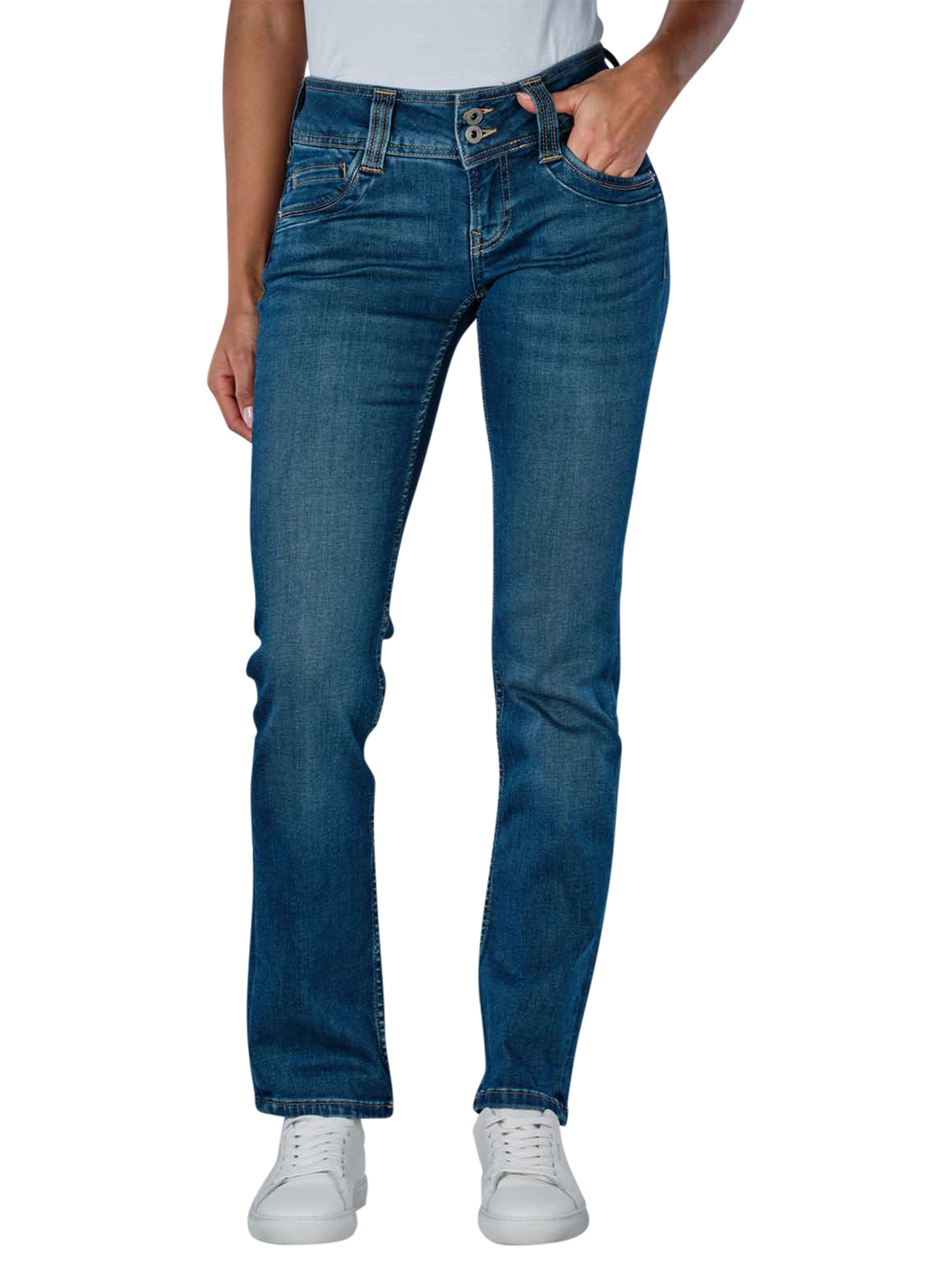 Die Pepe Jeans Gen Mid Slim Fit in Mittelblau präsentiert sich als modische Jeans für Frauen mit geradem Beinausschnitt und mittlerer Bundhöhe. Diese Five-Pocket-Hose überzeugt durch ihre Slim Fit Passform und angenehme Standarddicke. Dank des Stretchanteils bietet sie hervorragenden Tragekomfort. Der bequeme Reissverschluss und die mittlere Waschung runden das Design ab. Pflegeleicht, sie kann im Normalwaschgang bei 30°C gewaschen werden. Material: 84% Baumwolle, 15% Polyester, 1% Elasthan.