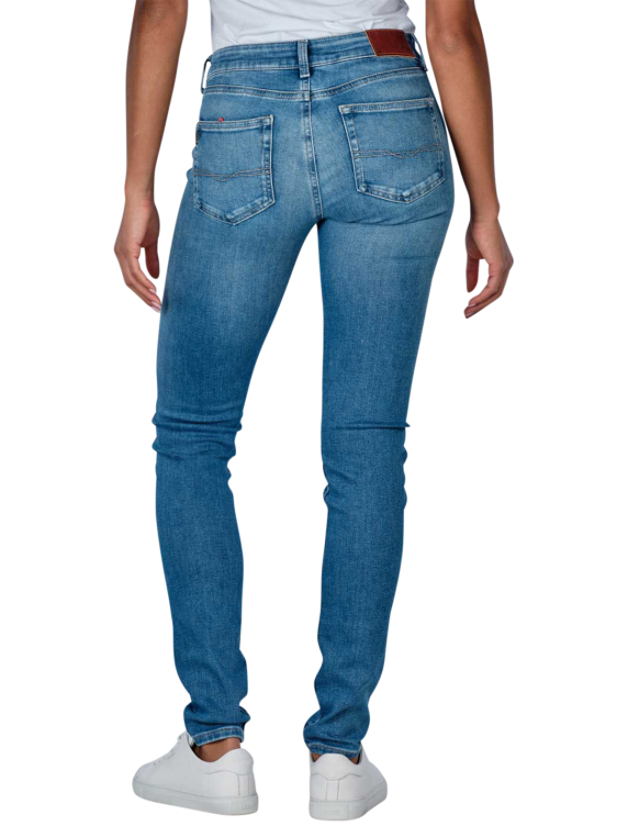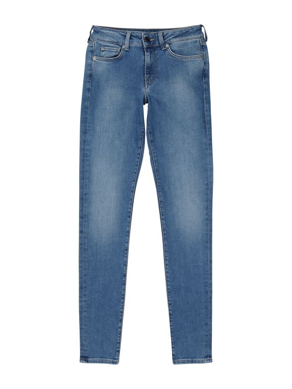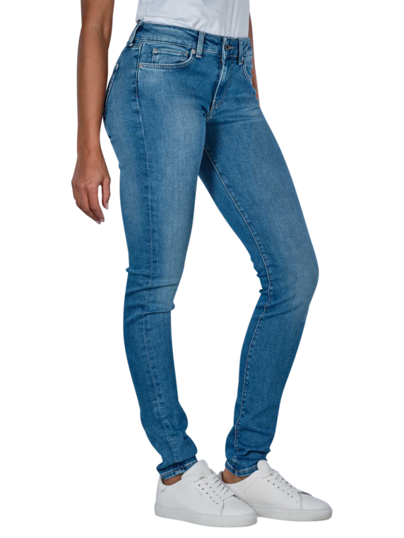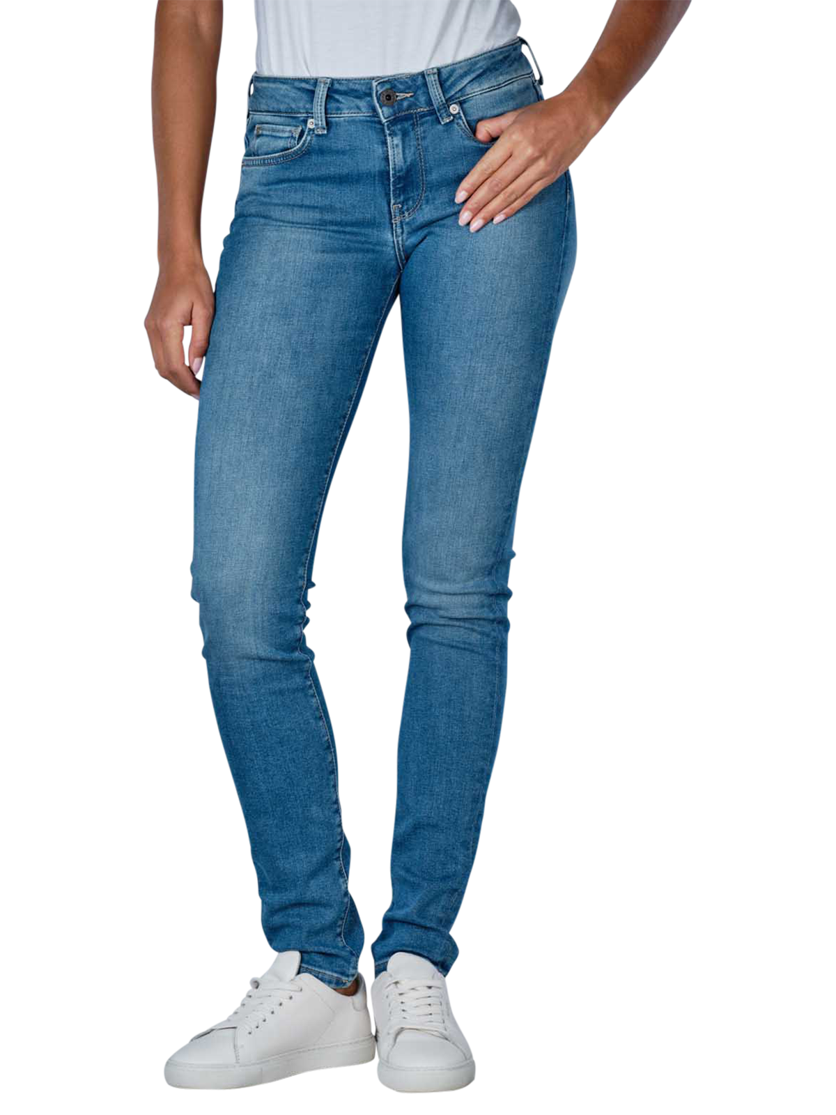Die Pepe Jeans Soho Low Skinny Fit in Medium Blue ist eine stilvolle Damenjeans, die sich durch ihren engen Beinausschnitt und mittelhohen Bund auszeichnet. Die hellblaue Jeans kombiniert eine hautenge Passform mit Standardstoffdicke und Stretchanteil für optimalen Tragekomfort. Als klassische Five-Pocket-Hose mit Reissverschluss präsentiert sie sich in einer hellen Waschung. Gefertigt aus 90% Baumwolle, 6% Polyester und 4% Elasthan, ist sie pflegeleicht bei 40°C im Normalwaschgang.