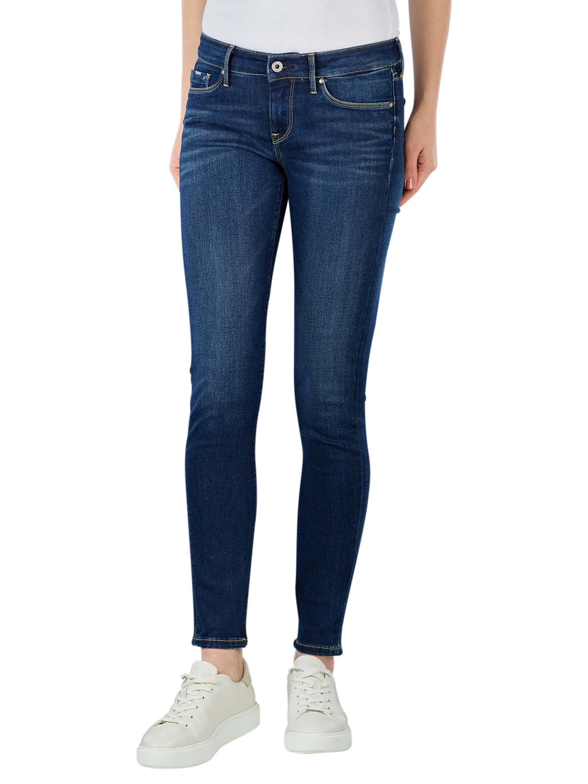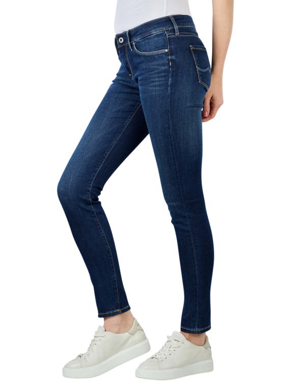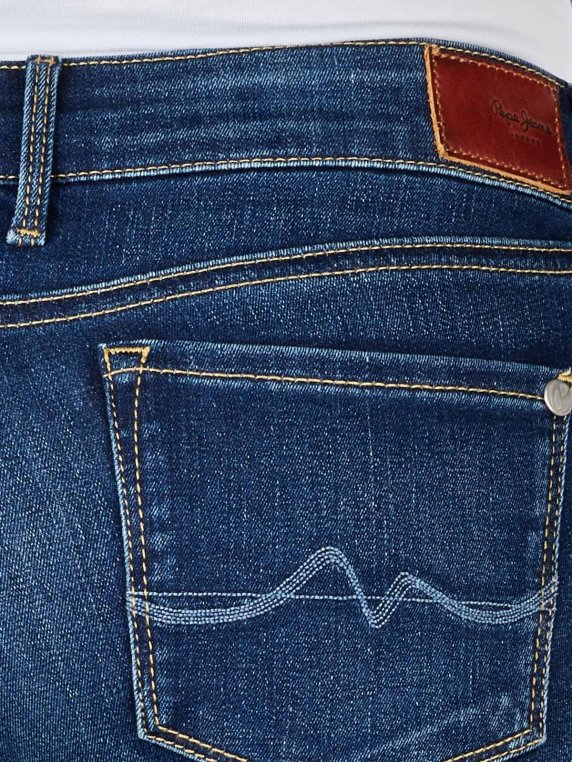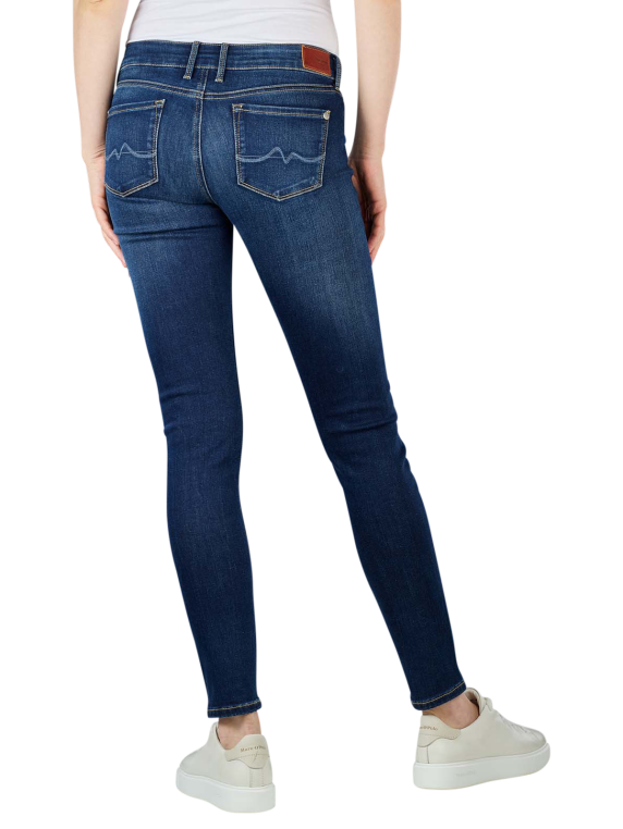 Diese Jeans von Pepe Jeans ist eine dunkelblaue Five-Pocket-Jeans im Used-Look mit mittlerer Bundhöhe. Die offizielle Farbbezeichnung des Modells Soho lautet Dark Used Worn. Es ist eine sehr eng geschnittene Damenjeans, die vorteilhaft die Silhouette der Trägerin betont. Die Jeans ist aus einem Baumwolle-Polyester-Gemisch mit einem Stretchanteil gefertigt und kann bei 40 Grad Celsius gewaschen werden.
