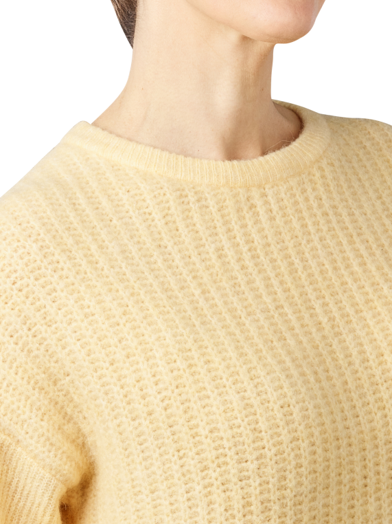 Der Longsleeve Round Neck Damenpullover von der Marke Armedangels hat eine lockere Passform, lange Ärmel und einen klassischen Rundhalsausschnitt. Das gestrickte Modell in der zarten Farbe Milky Vanilla zeichnet sich durch sein Zierstrickmuster auf der Vorderseite aus, der Rückenteil und die Ärmel besitzen ein feineres Längsstrickmuster. Gefertigt ist der Pullover aus einer edlen Mischung: 35 % Alpaka, 35 % Schurwolle, 24 % Polyamid und 6 % Elasthan sorgen für wärmenden Komfort.