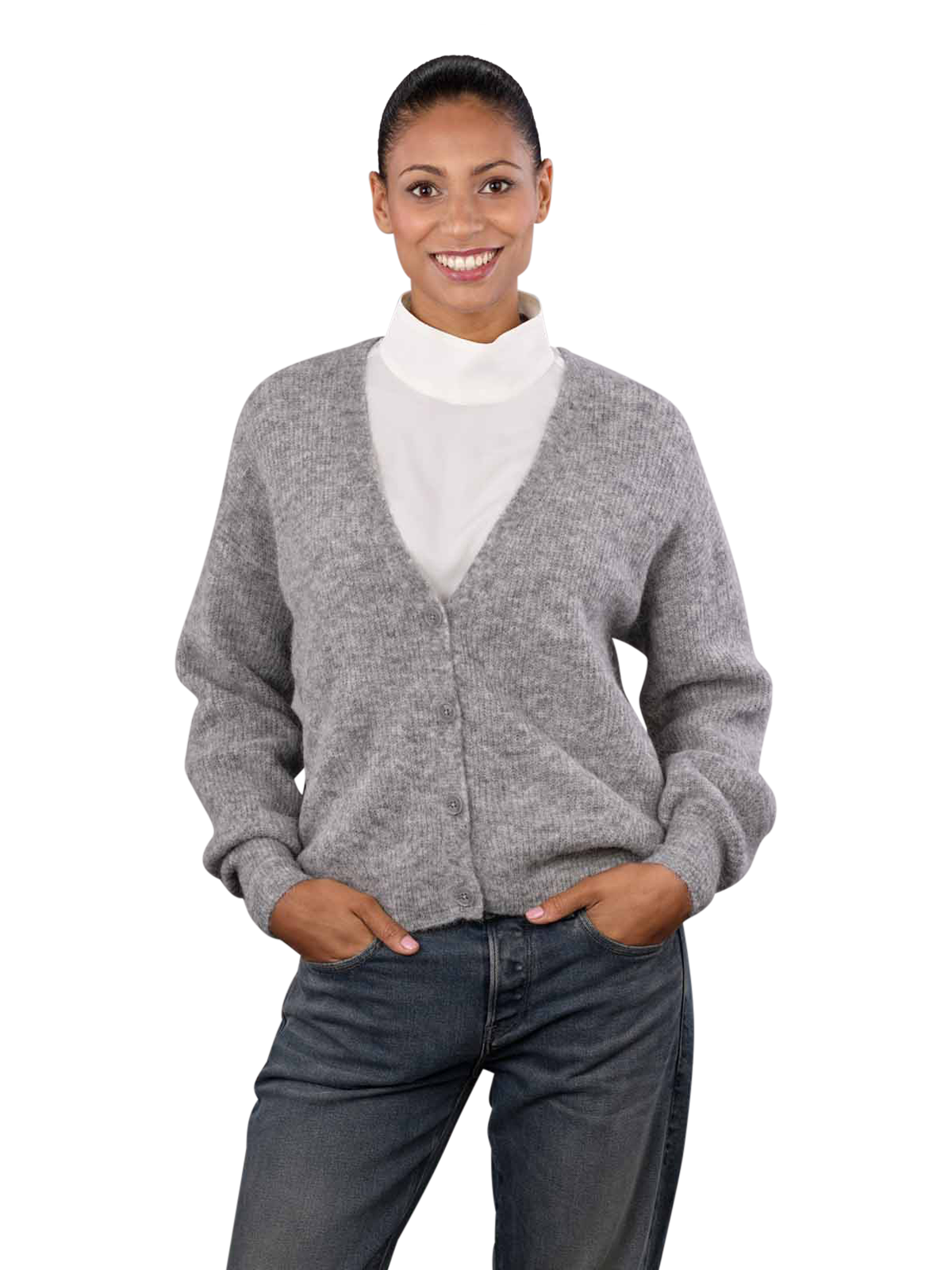 Der Mos Mosh Thora V-Neck Cardigan in der Farbe Grau ist ein stilvoller Frauen-Cardigan mit V-Ausschnitt. Er besteht aus 33% Alpaka, 33% Wolle, 29% Polyamid und 5% Elasthan, was ihn weich und angenehm zu tragen macht. Der Cardigan ist RWS-zertifiziert und sollte per Hand gewaschen werden. Er eignet sich hervorragend als vielseitiges Kleidungsstück für jede Garderobe und ist ein Must-Have für modebewusste Frauen.