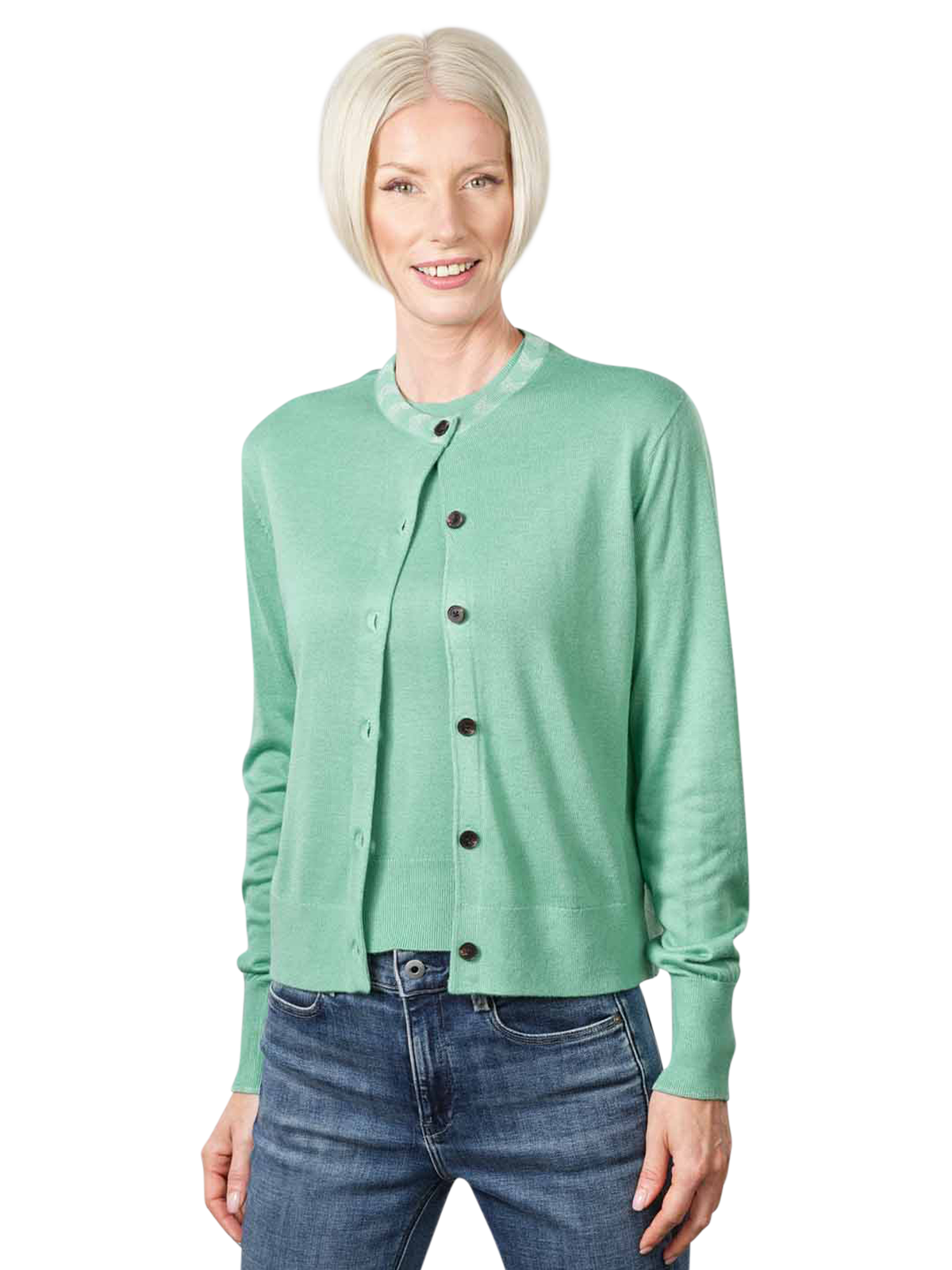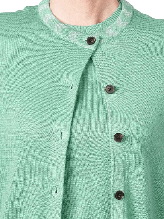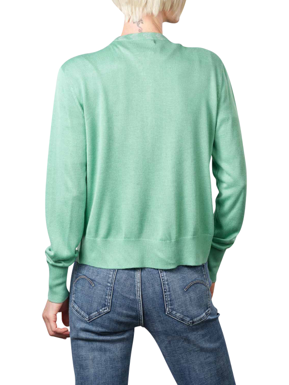 Der Scotch & Soda Jacquard Trim Cardigan Crew Neck für Damen in der Farbe Frozen Mint ist ein modischer Begleiter in der kühlen Jahreszeit. Mit einer pflegeleichten Materialmischung aus 55% Viskose, 39% Polyacryl und 6% Wolle ist er angenehm zu tragen und besticht durch einen Jacquard Rundhals-Ausschnitt sowie feinen Rippenbündchen. Zur Pflege wird eine schonende Handwäsche empfohlen.
