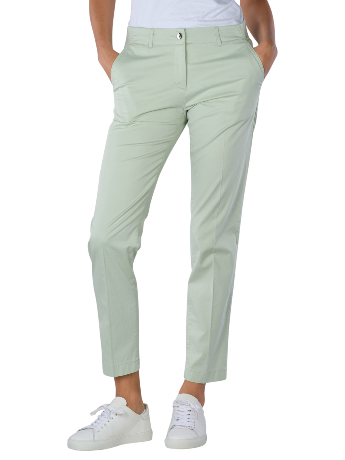 Entdecken Sie die Brax Maron Chino Cropped Regular Fit in einem eleganten Sage-Grün. Diese Damenhose vereint Stil und Komfort durch ihren Tapered Fit und den soften, dehnbaren Stoff. Der gerade Beinausschnitt und die mittlere Bundhöhe sorgen für eine schmeichelhafte Silhouette, während der Reissverschluss praktische Handhabung bietet. Hergestellt aus einer hochwertigen Mischung von 78% Baumwolle, 19% Lyocell und 3% Elasthan, ist sie perfekt für den Alltag. Maschinenwäsche bei 30°C im Schonwaschgang empfohlen.