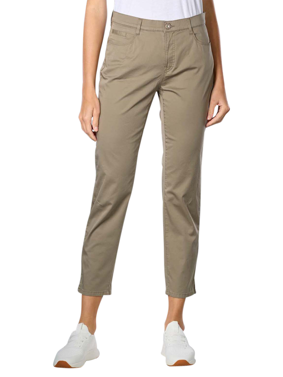 Die Brax Mary Jeans Slim Fit khaki ist eine optimale Hose für die wärmere Jahreszeit. Der leichte Baumwollstoff mit Stretchanteil schmiegt sich dem Körper an und lässt die Haut atmen.