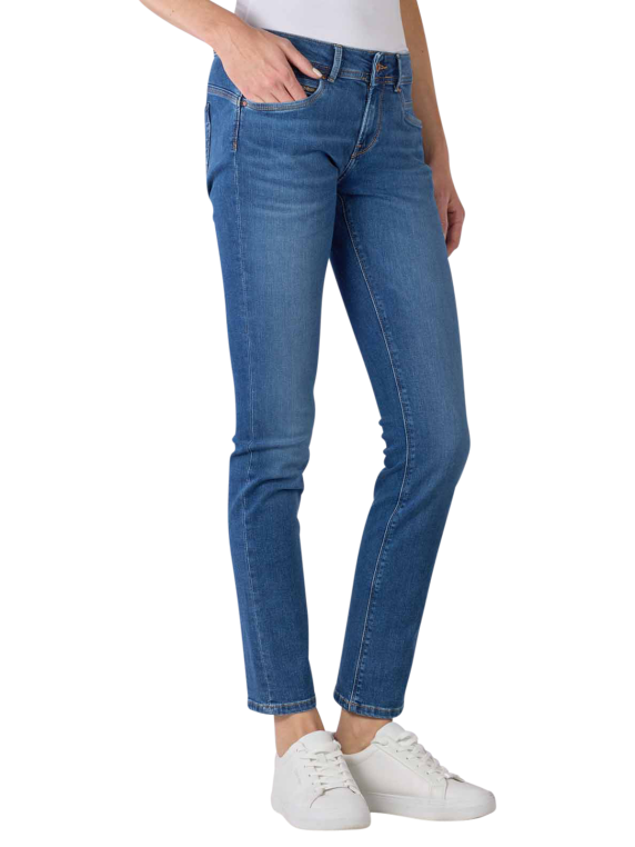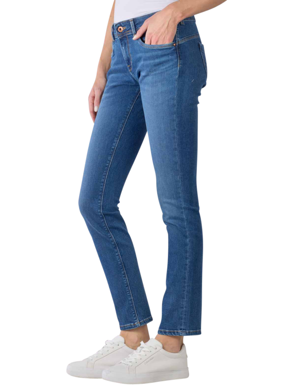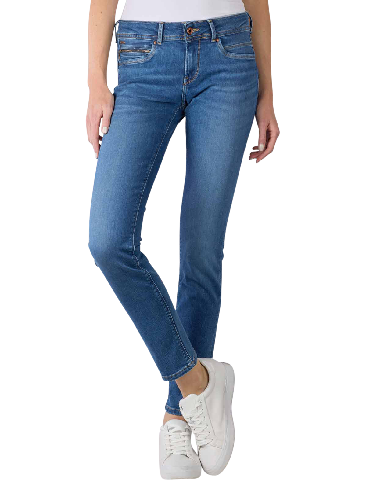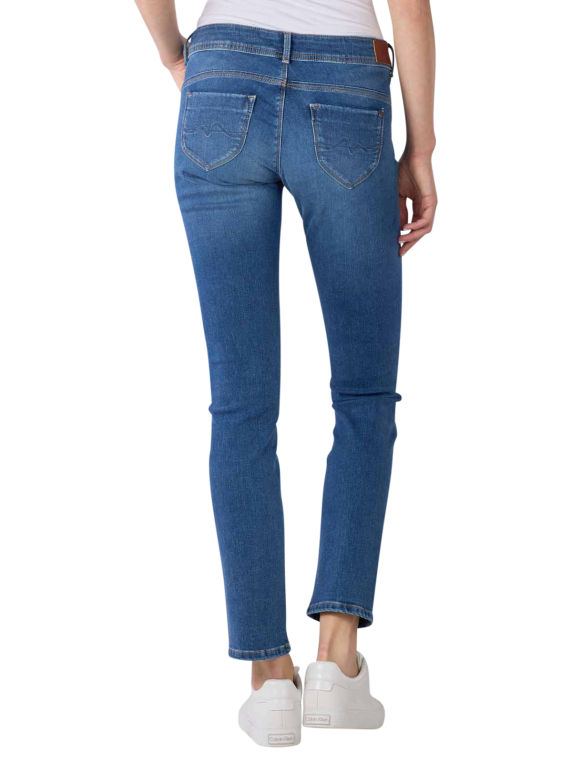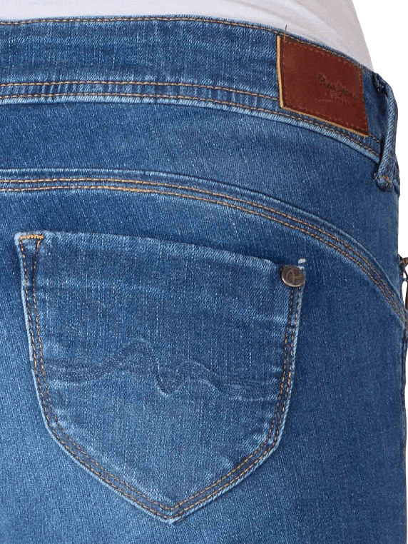 Mit der Pepe Jeans New Brooke Slim Fit in der Farbe Dark Blue kommt eine moderne 5-Pocket-Jeans mit intensiven Waschungen und optischen Sitzfalten in den Kleiderschrank. Die Damenjeans aus elastischem Bio-Baumwoll-Denim kombiniert einen mittelhohen Bund mit Knopf und Reissverschluss mit einer engen Silhouette und bietet dennoch einen hohen Tragekomfort. Darüber hinaus überzeugt die Jeans mit ihrer einfachen Reinigung und Pflege.