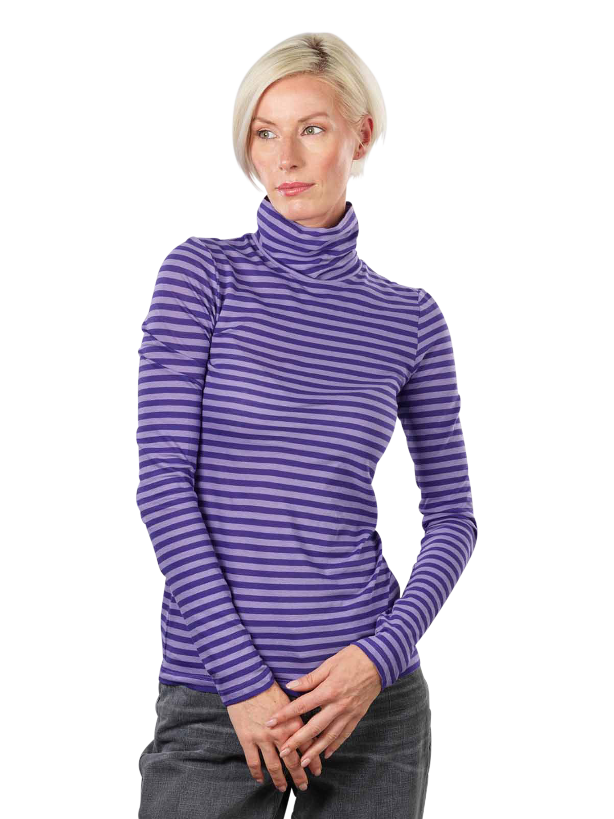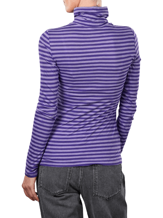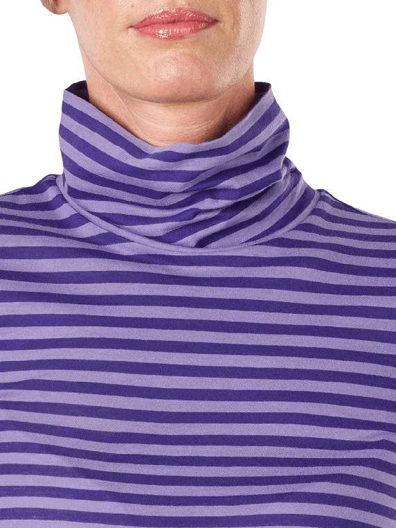 Der Langarm Rollkragenpullover wurde nachhaltig nach den Gesichtspunkten der GOTS ECO Programm aus 100 prozentiger Baumwolle gefertigt. Der eng anliegende Pullover, der in einem zweifarbigen Streifenmuster angeboten wird, ist angenehm zu tragen und verschafft der Trägerin eine schöne Figur. Das Kleidungsstück kann bei 30 Grad im Schonwaschgang gewaschen werden und sollte nicht im Trommeltrockner getrocknet werden, um die Passform beizubehalten.
