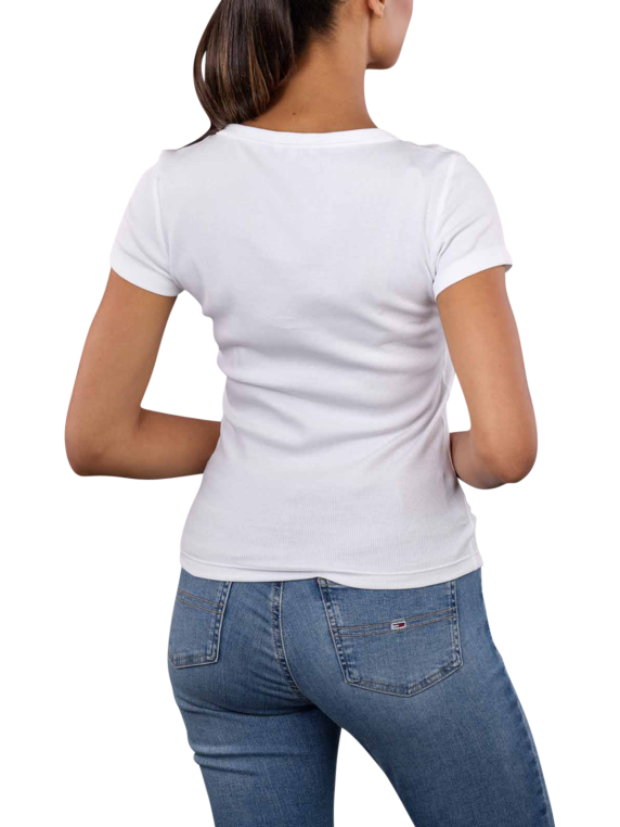 Das Tommy Jeans Essential T-Shirt Slim V-Neck in Weiss ist ein stilvolles und bequemes Kleidungsstück für Frauen. Es besticht durch seinen V-Ausschnitt und besteht aus 95% Baumwolle und 5% Elasthan, was für hohen Tragekomfort und Flexibilität sorgt. Das T-Shirt sollte im Spezialschonwaschgang bei 30¬#x221E;C gewaschen werden und nur Sauerstoffbleiche genutzt werden. Perfekt für lässige Alltagslooks.