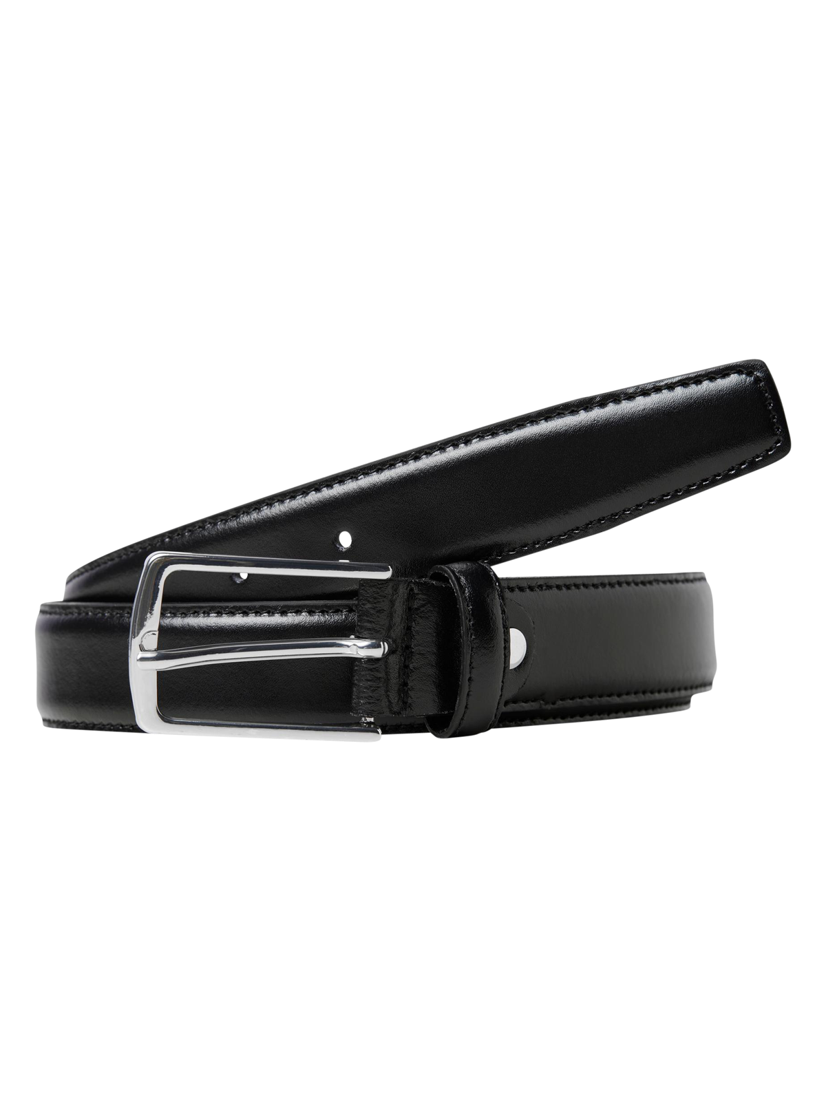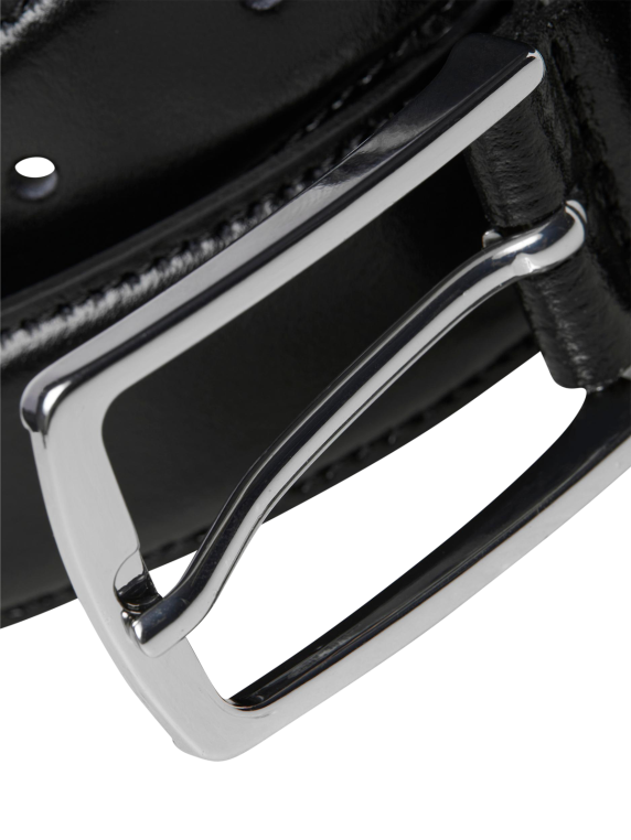 Der Jack & Jones Christopher Leather Belt in schwarz ist aus hochwertigem Rindsleder gefertigt. Die eleganten Nähte des Gürtels sind ebenfalls schwarz gehalten. Die Weite kann problemlos über die silberne Dornschliesse reguliert werden. Die Lederoberfläche ist leicht glänzend und passt so perfekt zum eleganten Verschluss.