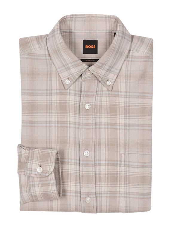 Das Boss Orange Rickert Shirt Regular Fit Button Down in Beige bietet einen klassischen Button-Down-Kragen und eine bequeme Passform. Es eignet sich für formelle und legere Anlässe. Die Pflege ist einfach, da es bei 30°C im Normalwaschgang gewaschen werden kann. Hergestellt aus 100% Baumwolle, sorgt es für ein angenehmes Tragegefühl und Atmungsaktivität, was es zu einer praktischen Wahl für den modernen Mann macht.