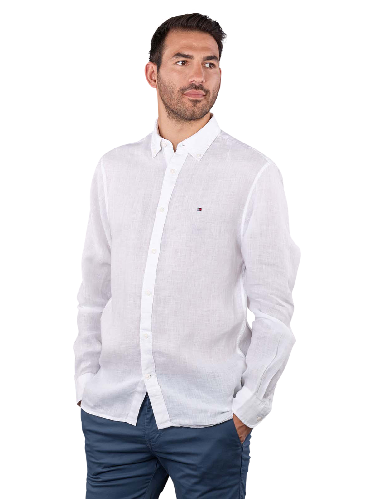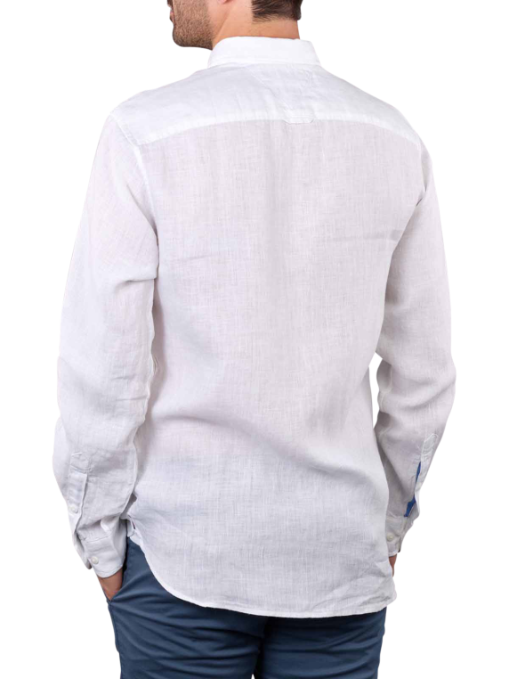 Das weisse unifarbene Hemd ohne Brusttasche in Regular Fit aus 100 % Leinen besitzt einen langen Arm mit einem Button-Down Kragen. Dieses Hemd wurde mit einem dezent sichtbaren Logo auf der linken Brustseite versehen. Der Leinenstoff fällt attraktiv und sorgt für einen frischen Look.