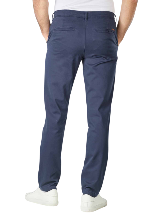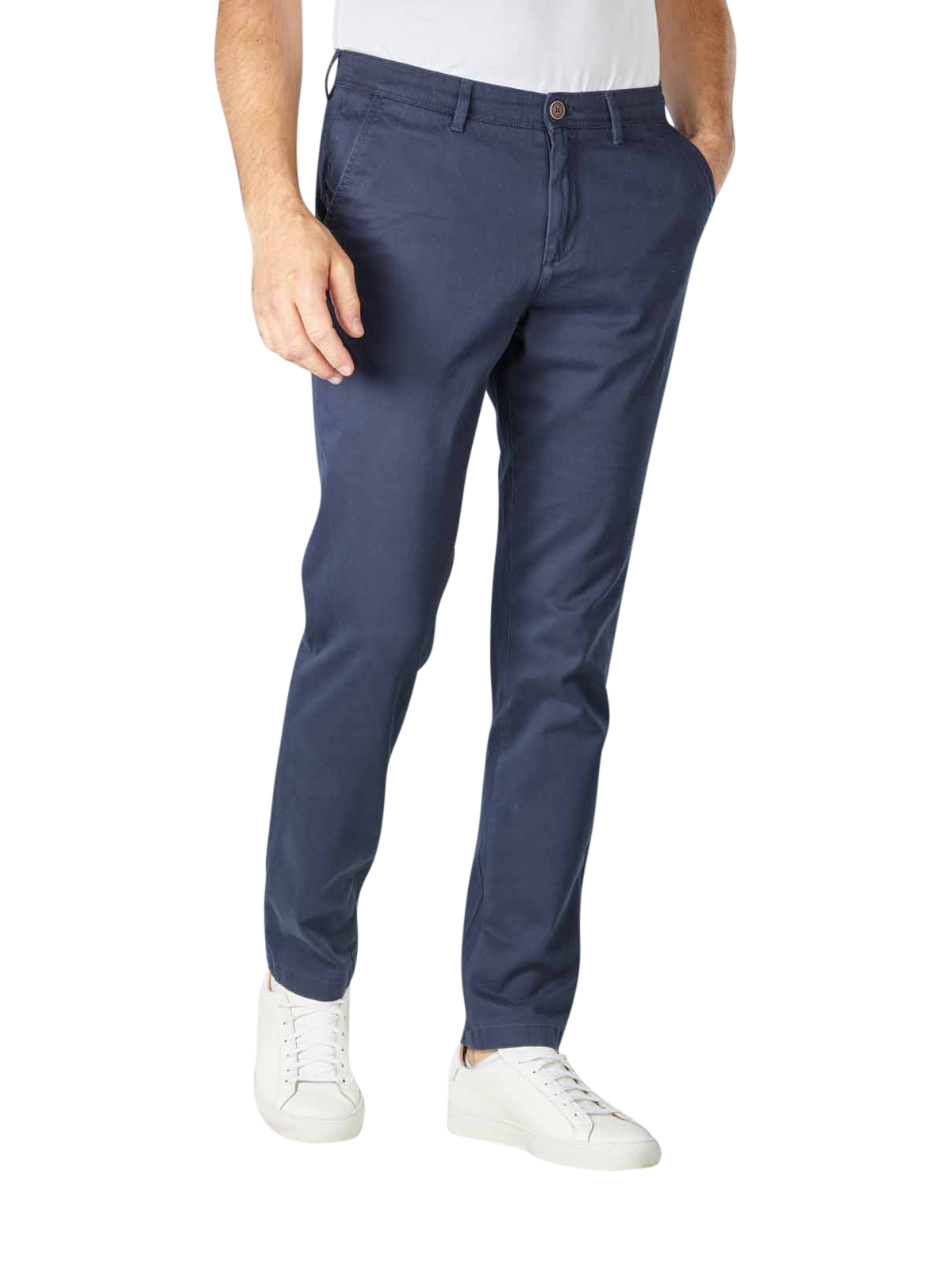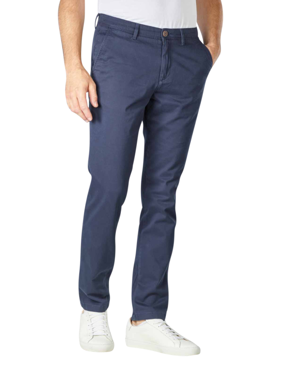 Bei der Jack & Jones Marco Bowie Chino Slim Fit in der Farbe Navy Blazer handelt es sich um eine klassische Chino mit mittlerer Bundhöhe und einem engen, geraden Bein. Hergestellt aus einem hochwertigen Baumwollgewebe mit Stretch-Anteil bietet die Herrenhose eine gute Passform sowie ein komfortables Tragegefühl. Darüber hinaus ist die Chino pflegeleicht, denn sie ist bei 40 °C im Normalwaschgang waschbar und trocknergeeignet.
