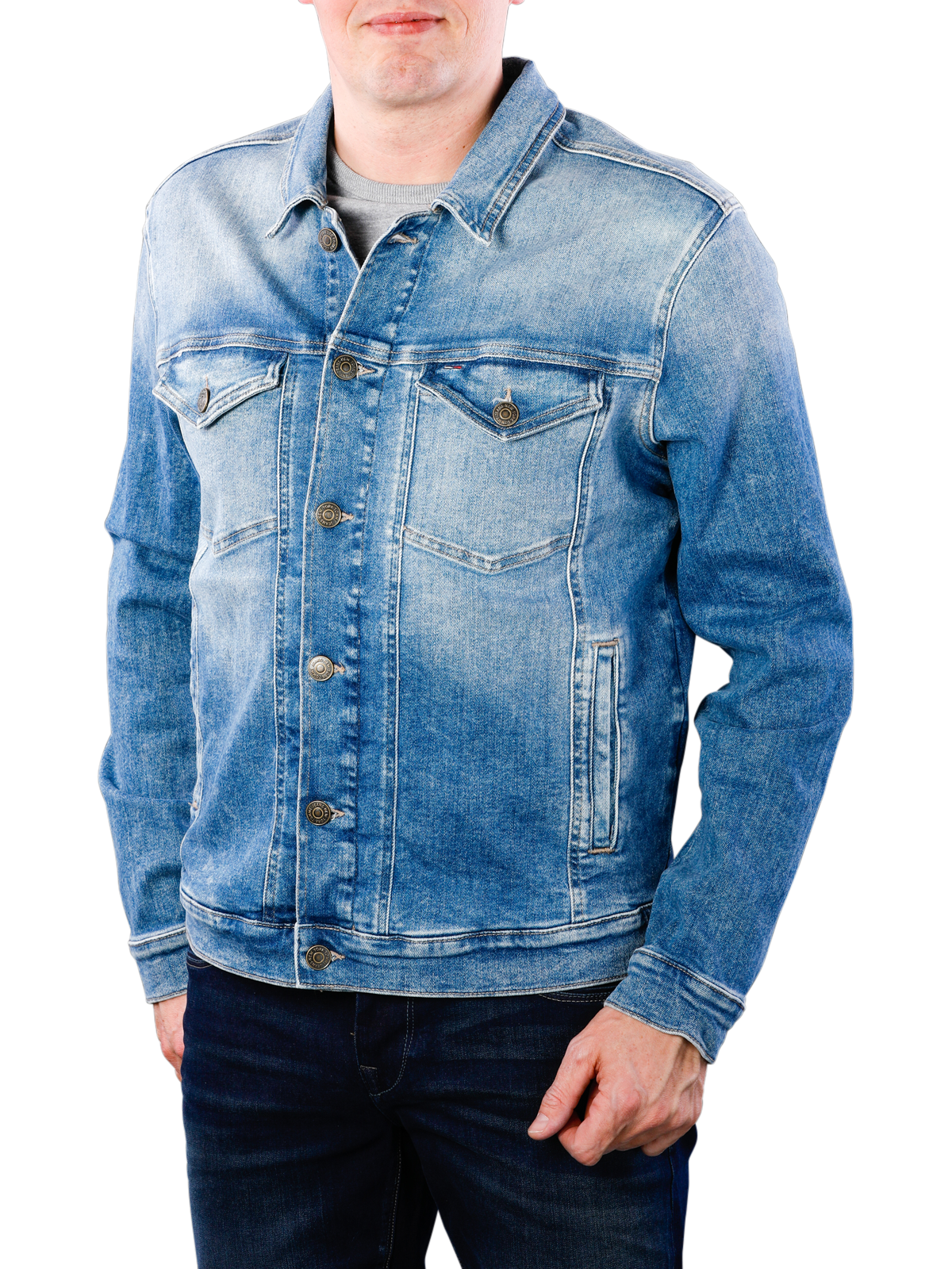 Ein klassisches Basic in bester Qualität ist diese Jeansjacke von Tommy Jeans. Kombinieren Sie die Jacke mit Pattentaschen auf der Brust und seitlichen Eingrifftaschen zu einem lässigen T-Shirt oder Longsleeve.