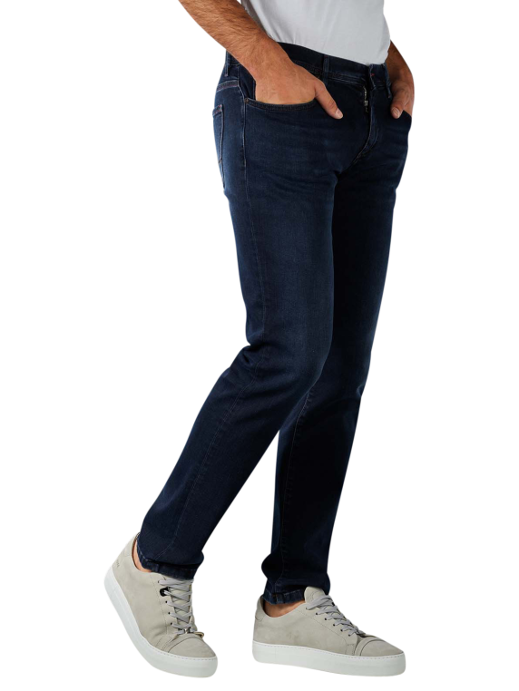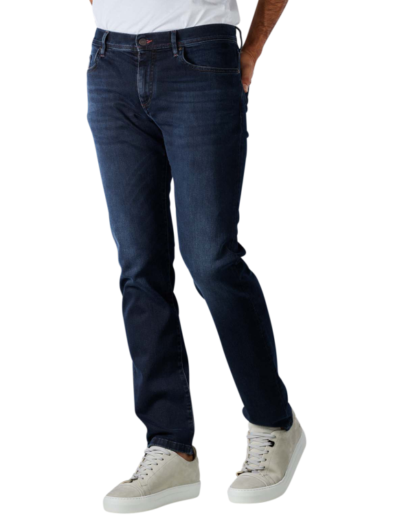 Die Alberto Pipe Lefthand Denim Jeans Slim Fit hat eine dunkelblaue Waschung und eine leichte Bleichung an den Knien. Sie ist im Slim Fit gerade geschnitten und hat einen mittel hohen Bund. Der Stoff hat einen Stretchanteil. Geschlossen wird die Jeans mit einem Reissverschluss und einem Knopf. Im hinteren Bund ist ein braunes Alberto Logo eingenäht.