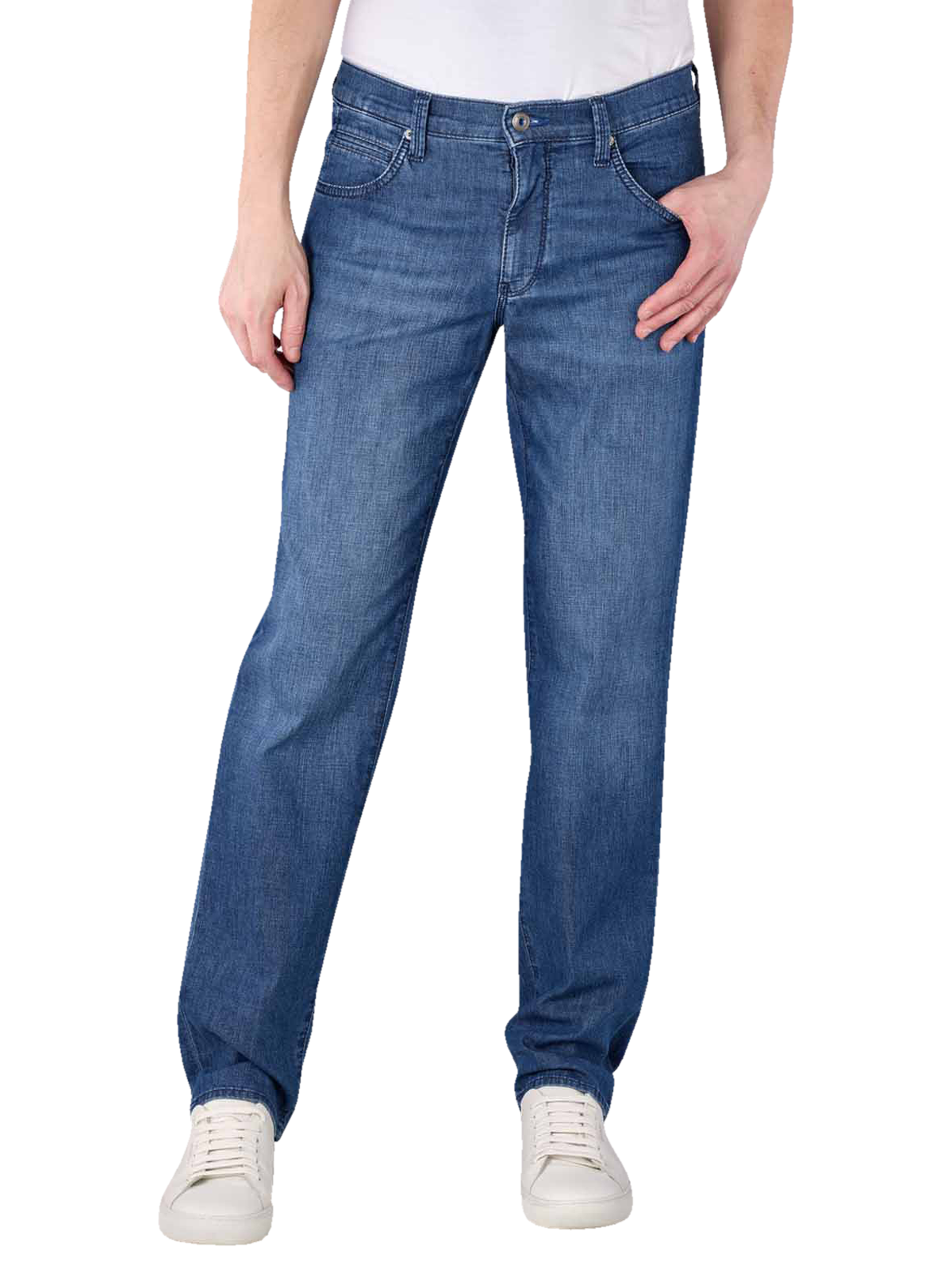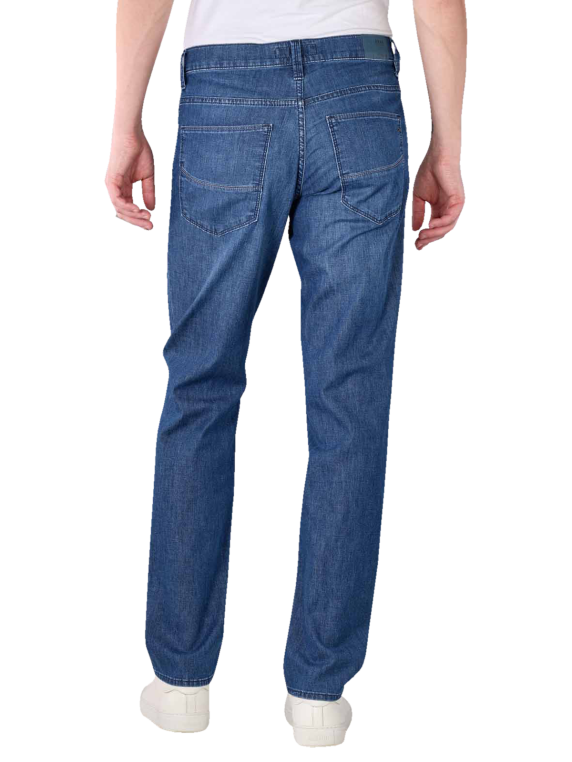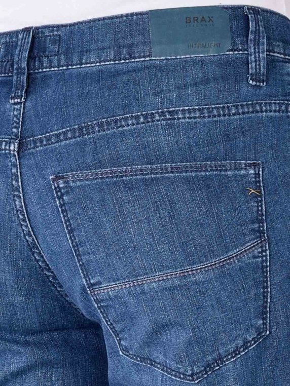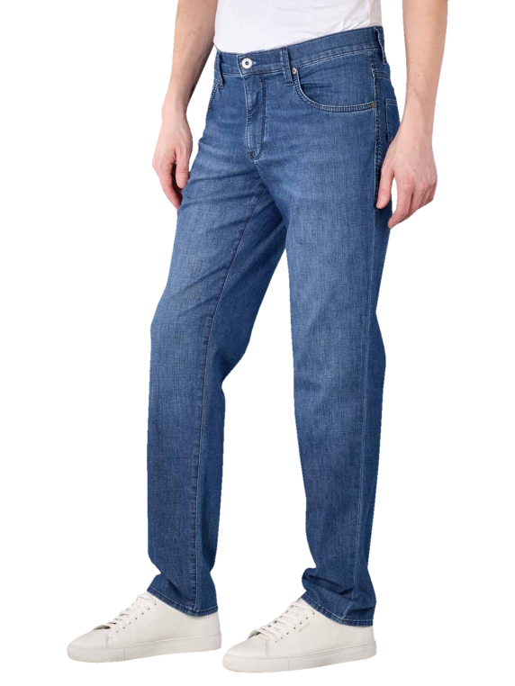 Die Brax Ultra Light Cadiz (Cooper New) Jeans im Straight Fit hat die Farbe Regular Blue und ist mit leichten Waschungen, optischen Sitzfalten und dem klassischen 5-Pocket-Look ein Must-Have. Hergestellt aus einer leichten Baumwoll-Polyester-Mischung mit Stretch-Anteil bietet die Herrenjeans ein komfortables Tragegefühl, das von der mittleren Leibhöhe und den geraden Beinen weiter verbessert wird. Waschbar ist die Jeans bei 30 °C im Schonwaschgang.