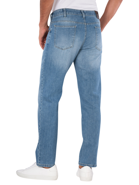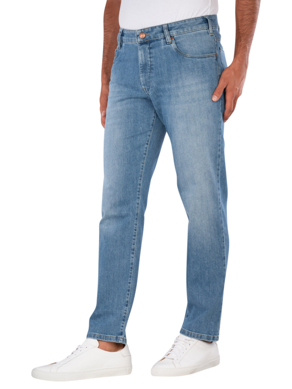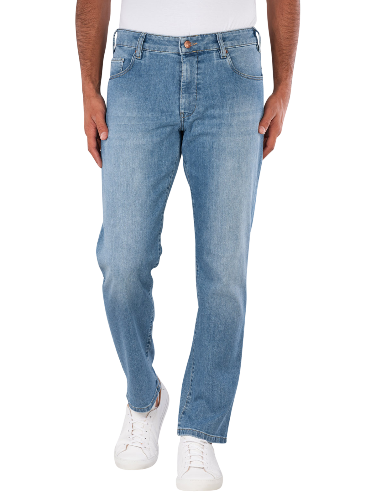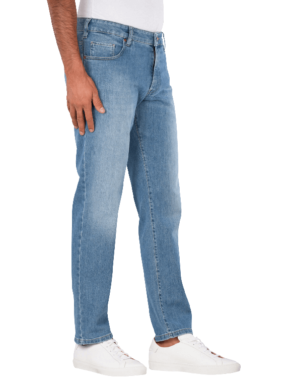 Die Meyer M5 Jeans Regular Fit in Hellblau bietet eine gerade Beinausschnitt und mittlere Bundhöhe. Sie ist mit einem Reissverschluss ausgestattet und verfügt über fünf Taschen für praktischen Stauraum. Der Stretchanteil sorgt für hohen Tragekomfort und Bewegungsfreiheit. Diese Jeans ist für den normalen Waschgang bei 40°C geeignet und entspricht umweltfreundlichen Standards. Ideal für den Alltag und vielseitig kombinierbar.