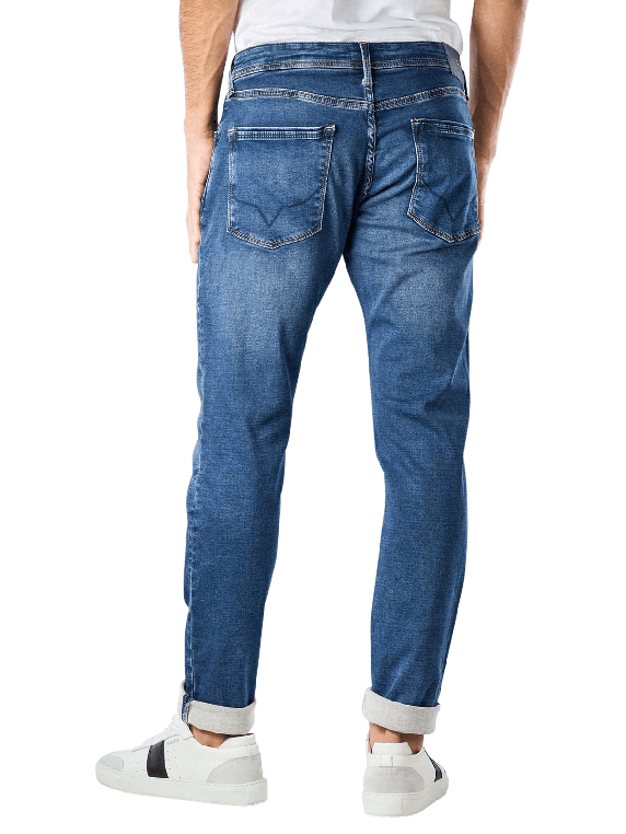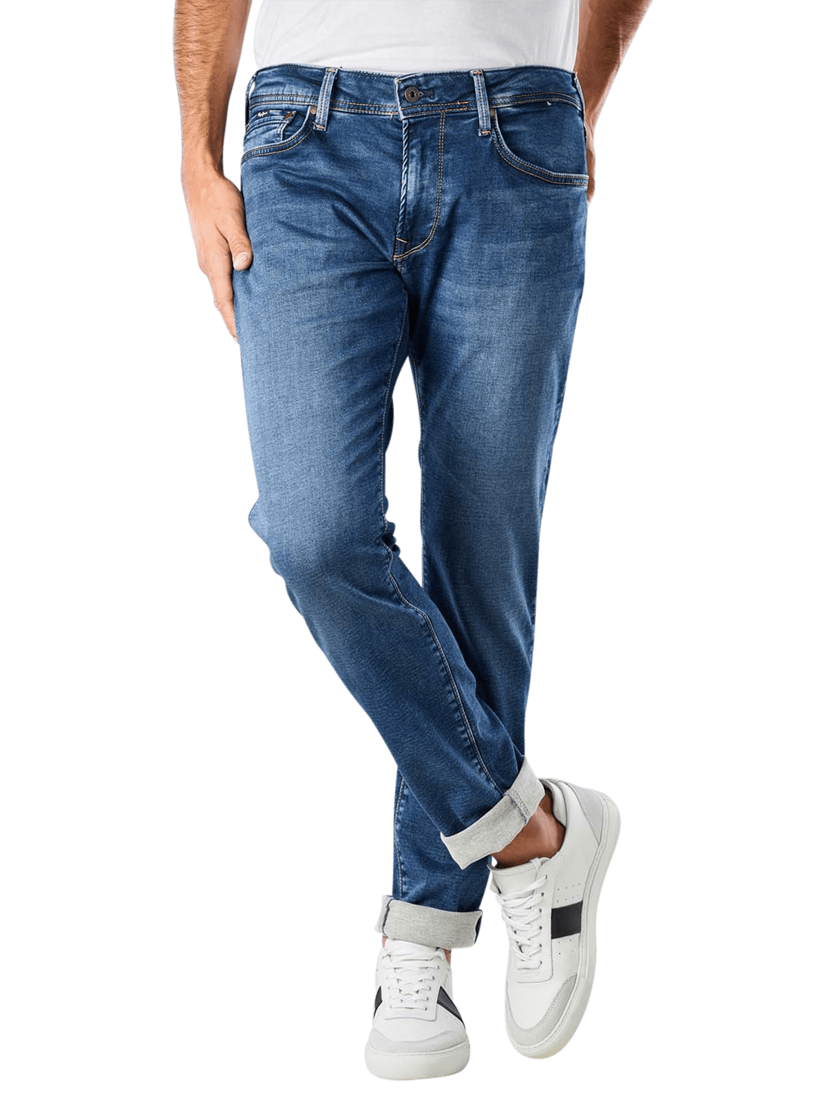 2 % Elasthan ergänzen die ansonsten reine Baumwolle der Pepe Jeans Stanley Tapered Fit. Von der mittleren Leibhöhe aus verläuft sie über gerade Oberschenkel zu schmalen Beinausschnitten. Diese Passform bietet auch stärkeren Oberschenkeln viel Platz und Bewegungsfreiheit. Nähte in Kontrastfarben betonen den Used Look, der sich mit Waschungen an den Oberschenkeln und dem Gesäss zeigt. Selbstverständlich dürfen auch bei dieser Jeans die Ziernähte auf den hinteren Taschen nicht fehlen.